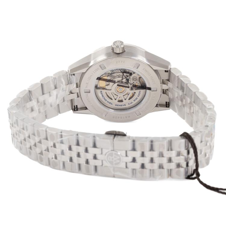 Raymond Weil Freelancer stainless steel automatic mens watch. Blue dial, date, case diameter: 38mm, wrist size: 21cm, Swiss made. Ref# 2771-ST-50051. With Raymond Weil stainless steel bracelet and clasp. With Undated Raymond Weil Guarantee card and Raymond Weil box. 12 month FSA warranty. (As new, Note; case and bracelet on original wrap)