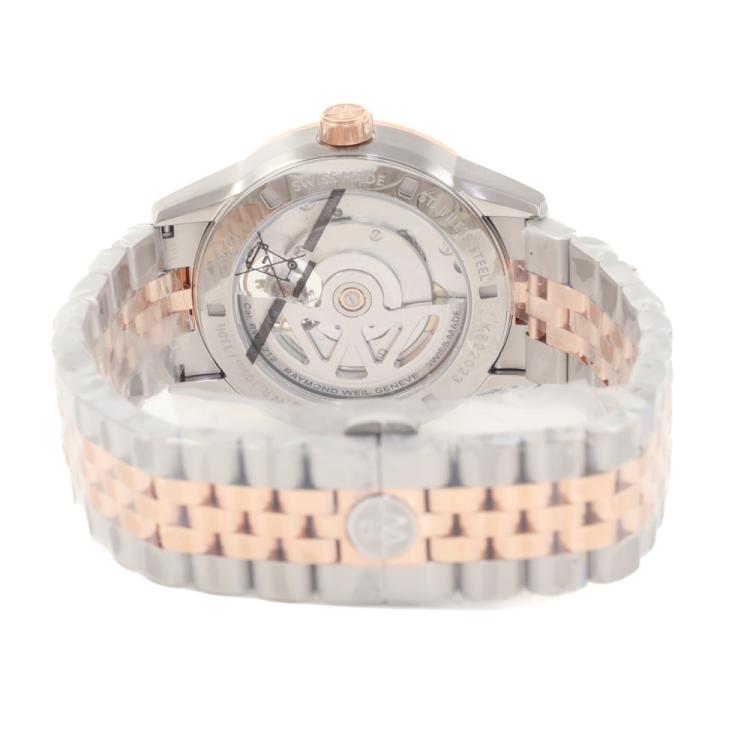Raymond Weil Freelancer stainless steel and rose gold PVD plating automatic mens watch. Black dial, case diameter: 42.5mm, wrist size: 21cm, Swiss made. Ref# 2781-SP5-20051. With Raymond Weil two-tone bracelet and clasp. With Undated Raymond Weil Guarantee card and Raymond Weil box. 12 month FSA warranty. (As new: Note: case and bracelet on original wrap).