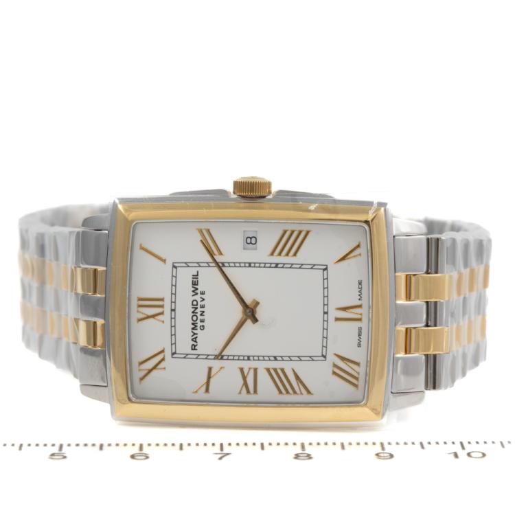 Raymond Weil Toccata Classic stainless steel with yellow gold PVD plating mens watch. White dial, date, case diameter: 37mm x 29mm, wrist size: 20.5cm, Swiss made. Ref# 5425-STP-00308. With Raymond Weil two-tone bracelet and clasp. With Undated Raymond Weil Guarantee card and Raymond Weil box. 12 month FSA warranty (AS new, Note: case and bracelet on original wrap).