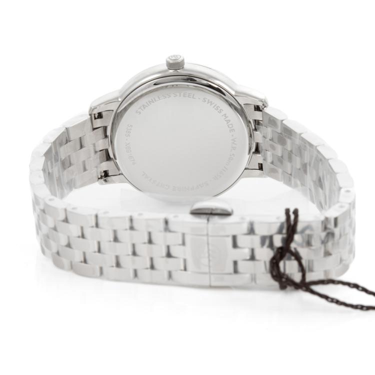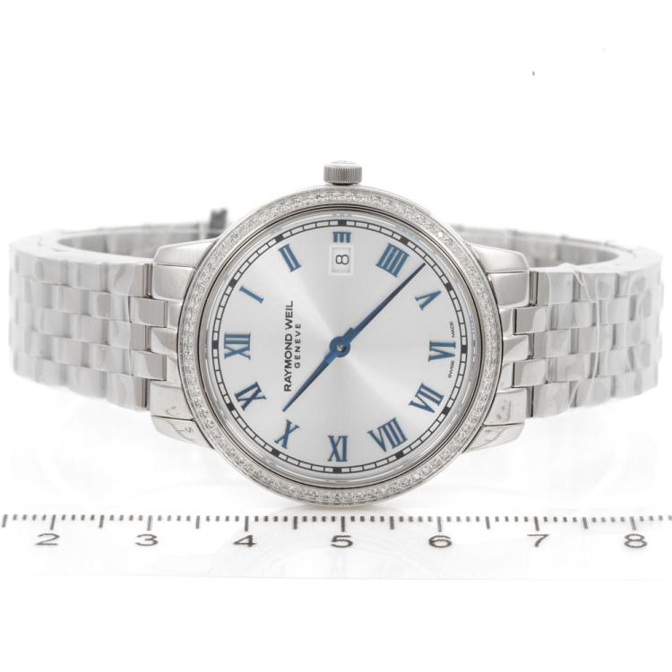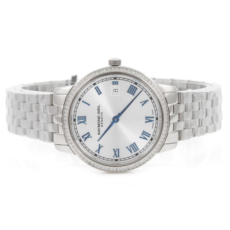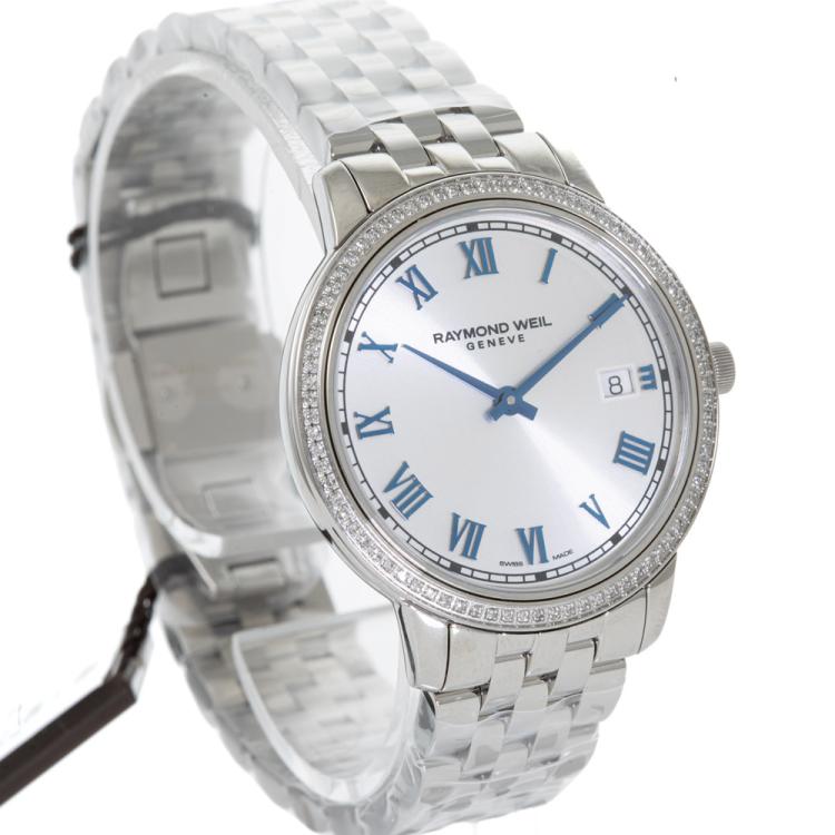 Raymond Weil Toccata stainless steel quartz ladies watch. Silver dial, Diamond set bezel, date, case diameter: 34mm, wrist size: 18cm, Swiss made. Ref# 5385-STS-00653. With Raymond Weil stainless steel bracelet and clasp. With Raymond Weil Guarantee card, Raymond Weil Certificate of Authenticity and Raymond Weil box. 12 month FSA warranty. (As new, Note: bracelet in original wrapping)