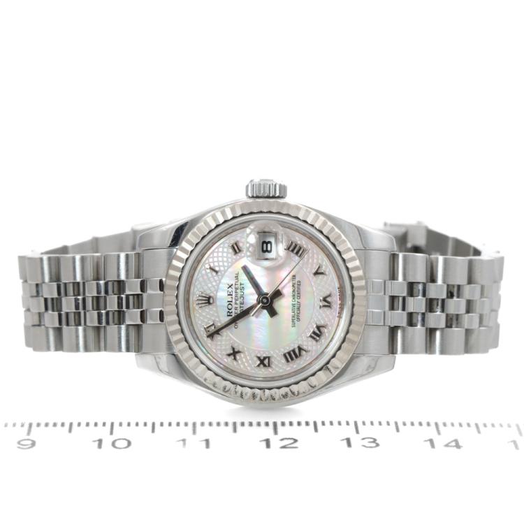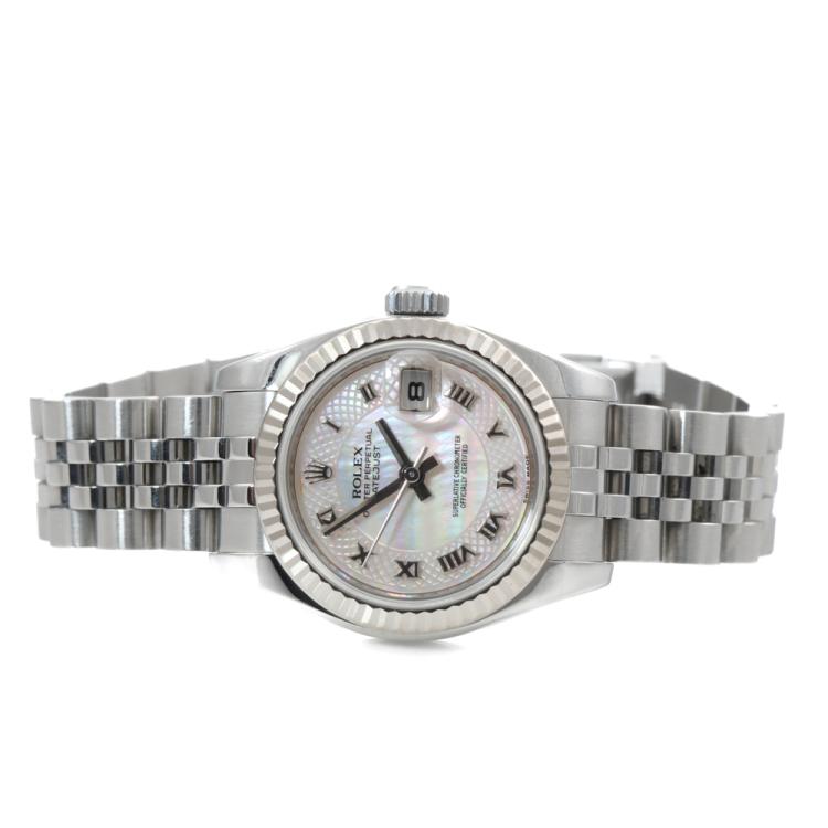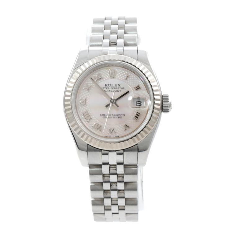 Rolex Oyster Perpetual Datejust 18ct white gold and stainless steel automatic mens watch. Mother of Pearl dial, date, case diameter: 26mm, wrist size: 15cm, Swiss made. Ref# 179174. Circa: 2007 or 2008. With Rolex stainless steel Jubilee bracelet and clasp. With Certificate of Authenticity and Rolex box with Rolex gift bag. 3 month FSA warranty (Pre-owned)