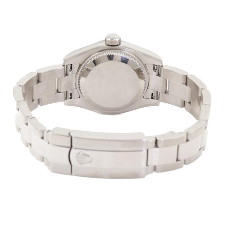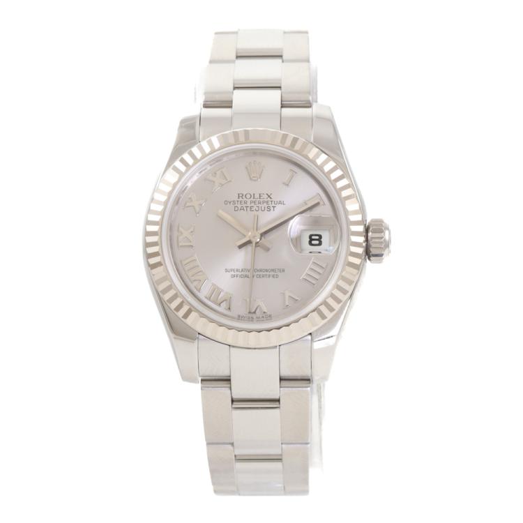 Rolex Oyster Perpetual Datejust stainless steel automatic ladies watch. Silver dial, 18ct white gold fluted bezel, date, case diameter: 26mm, wrist size: 16cm, Swiss made. Ref# 179174. Circa: 2011-2024. With Rolex stainless steel Oyster bracelet and clasp. With Certificate of Authenticity and Rolex box. 3 month FSA warranty (Pre-owned)