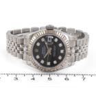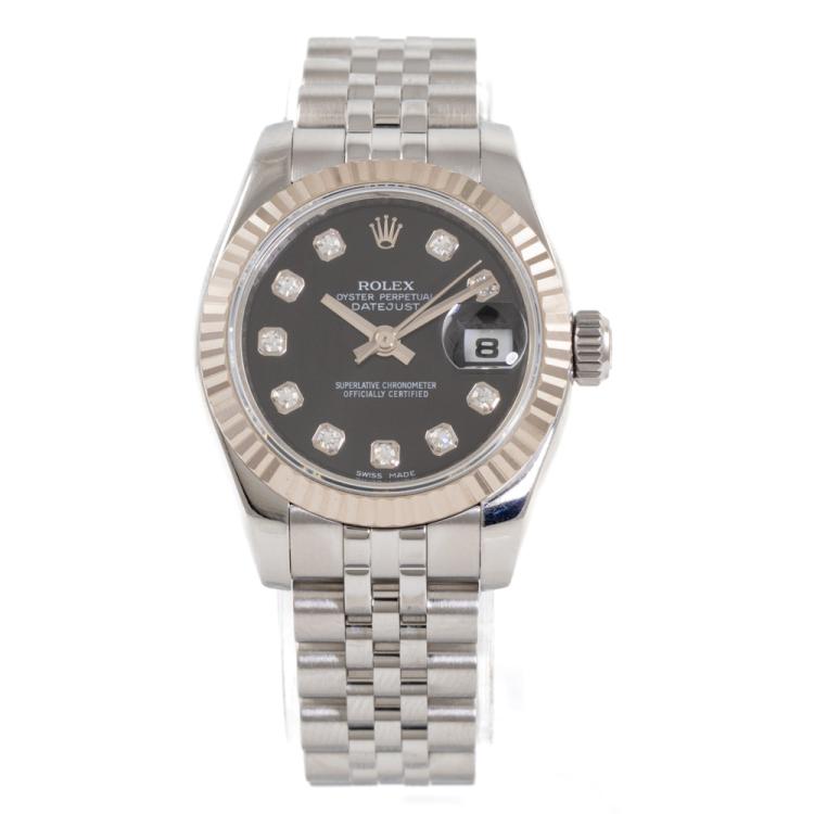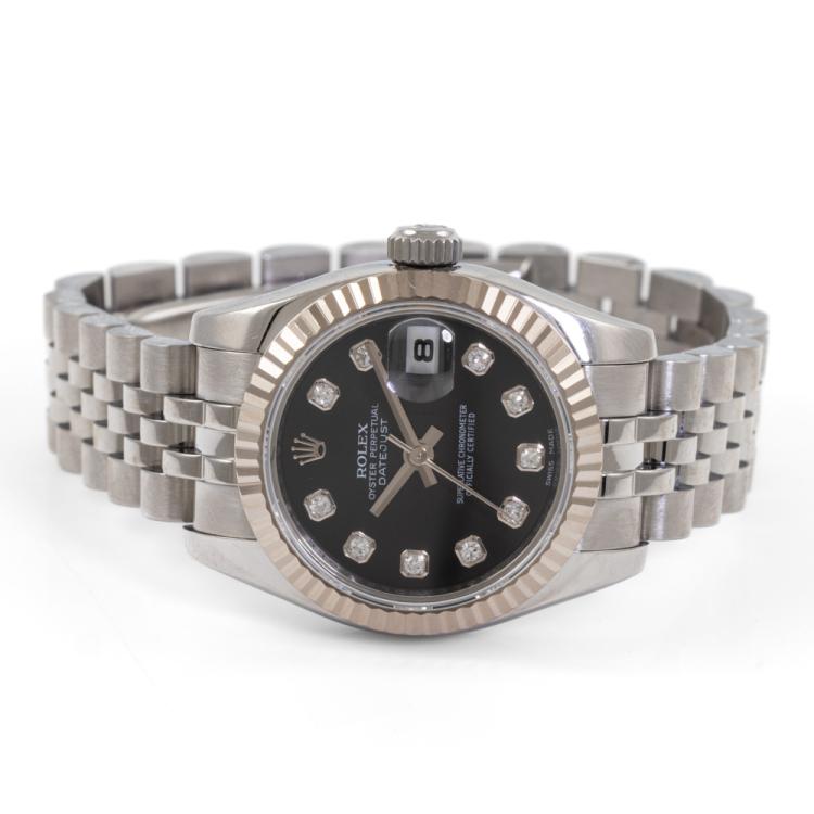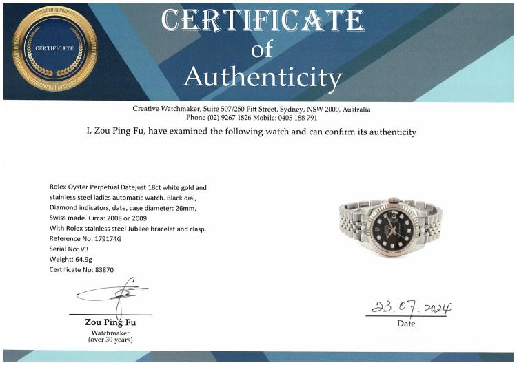 Rolex Oyster Perpetual Datejust 18ct white gold and stainless steel ladies automatic watch. Black dial, Diamond indicators, date, case diameter: 26mm, wrist size: 14cm, Swiss made. Ref# 179174G, Circa: 2008 or 2009. With Rolex stainless steel Jubilee bracelet and clasp. With Certificate of Authenticity and Rolex box. 3 month FSA warranty. (Pre-owned)