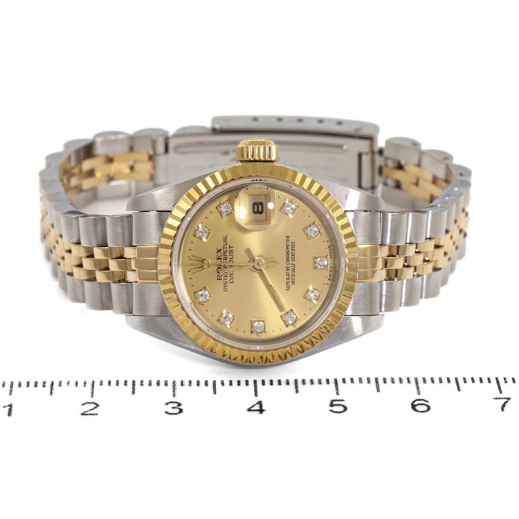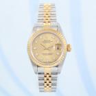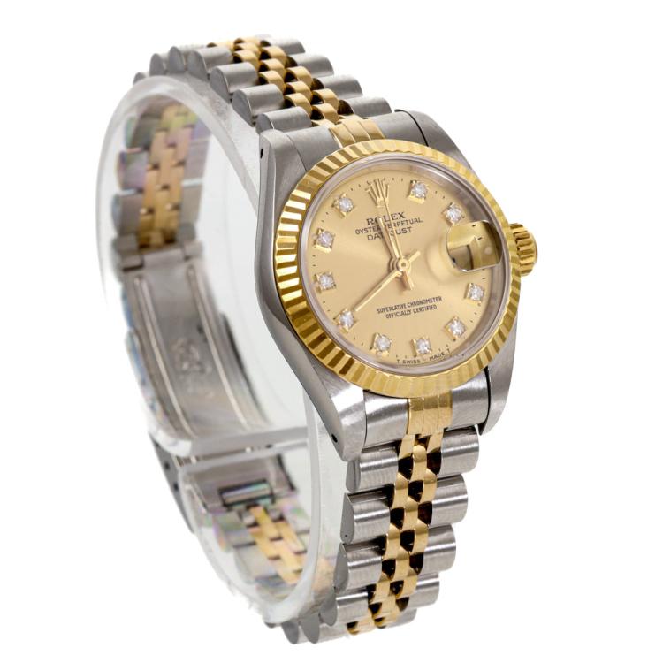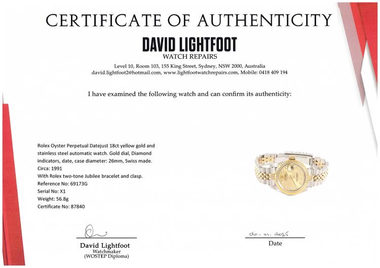 Rolex Oyster Perpetual Datejust automatic 18ct yellow gold and stainless steel ladies watch. Gold dial, Diamond indicators, date, case diameter: 26mm, wrist size: 17.5cm, Swiss made. Ref# 69173G. Circa: 1991. With Rolex two-tone Jubilee bracelet and clasp. With Certificate of Authenticity and Rolex box. 3 month FSA warranty (Pre-owned)