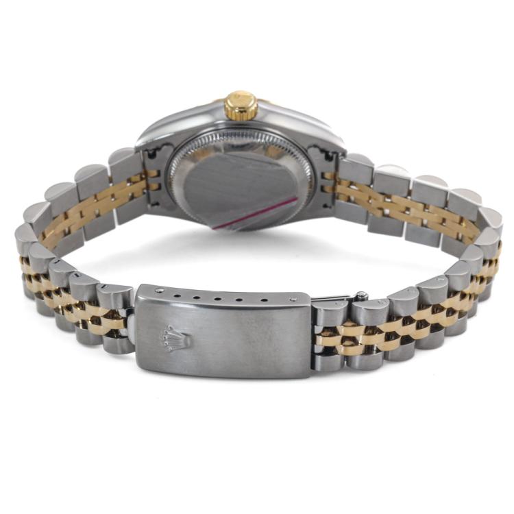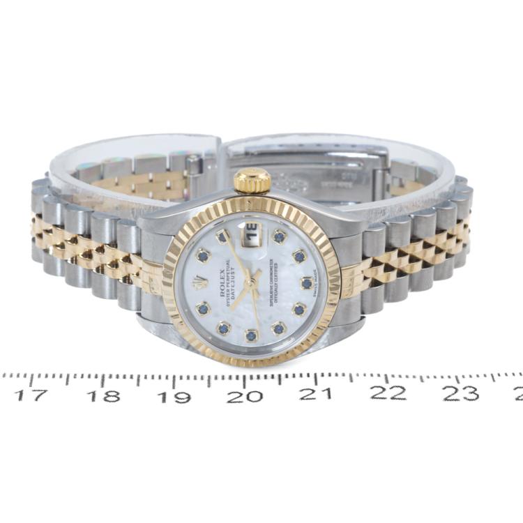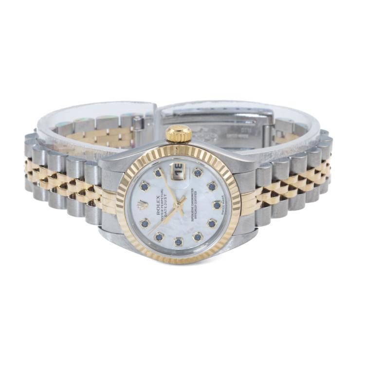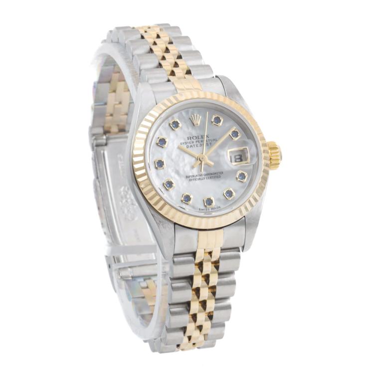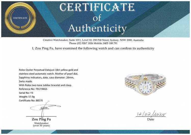 Rolex Oyster Perpetual Datejust 18ct yellow gold and stainless steel automatic ladies watch. Mother of Pearl dial, Sapphires indicators, date, case diameter: 26mm, wrist size: 17.5cm, Swiss made. Ref# 79173NGS. Circa: 2002. With Rolex two-tone Jubilee bracelet and clasp. With Certificate of Authenticity and Rolex box. 3 month FSA warranty (Pre-owned)