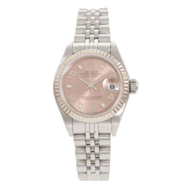 Rolex Oyster Perpetual Datejust stainless steel automatic ladies watch. Salmon dial, 18ct white gold fluted bezel, date, case diameter: 26mm, wrist size: 18cm, Swiss made. Ref# 79174. Circa: 2004. With Rolex stainless steel Jubilee bracelet and clasp. With Certificate of Authenticity and Rolex box. 3 month FSA warranty (Pre-owned).