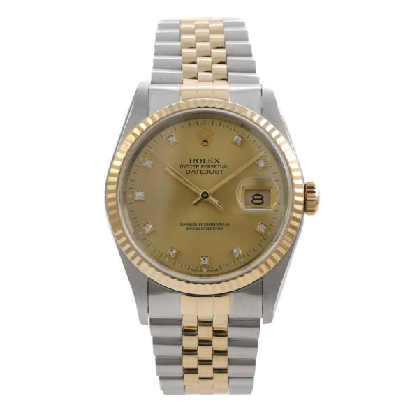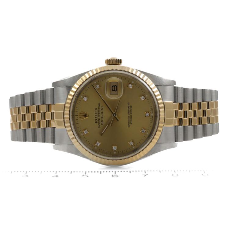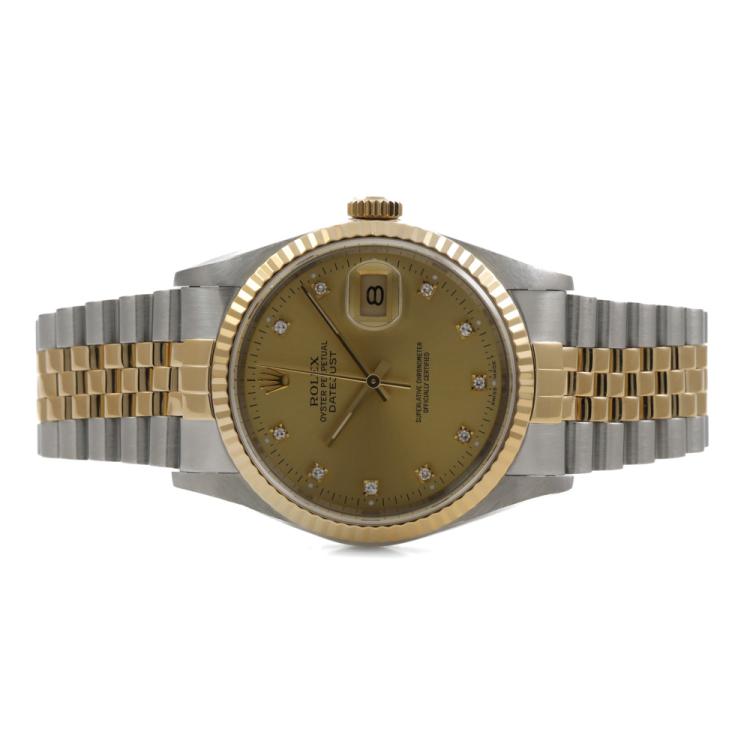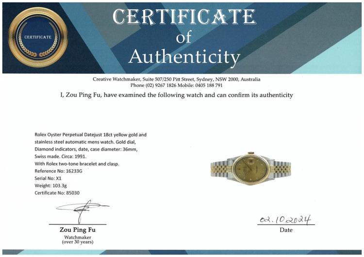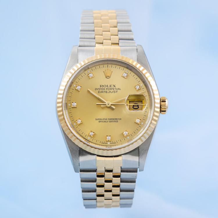 Rolex Oyster Perpetual Datejust 18ct yellow gold and stainless steel automatic mens watch. Gold dial, Diamond indicators, date, case diameter: 36mm, wrist size: 19.5cm, Swiss made. Ref# 16233G. Circa: 1991. With Rolex two-tone bracelet and clasp. With Certificate of Authenticity and Rolex box with Rolex gift bag. 3 month FSA warranty. (Pre-owned)