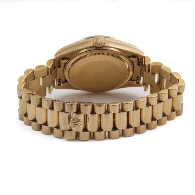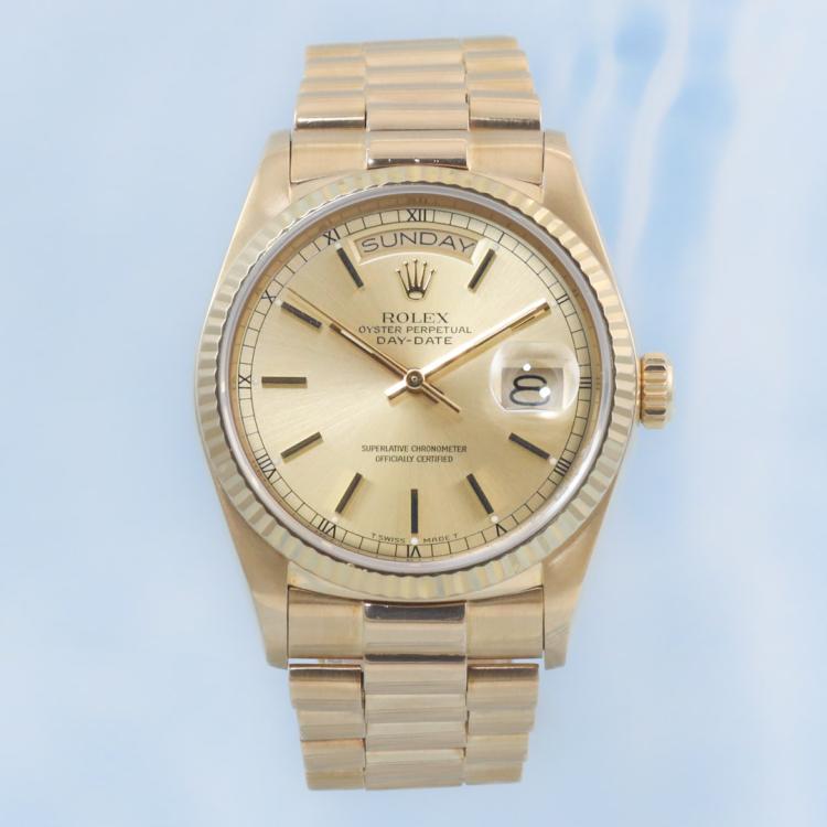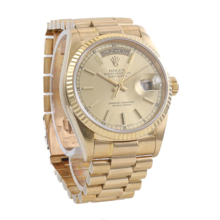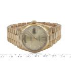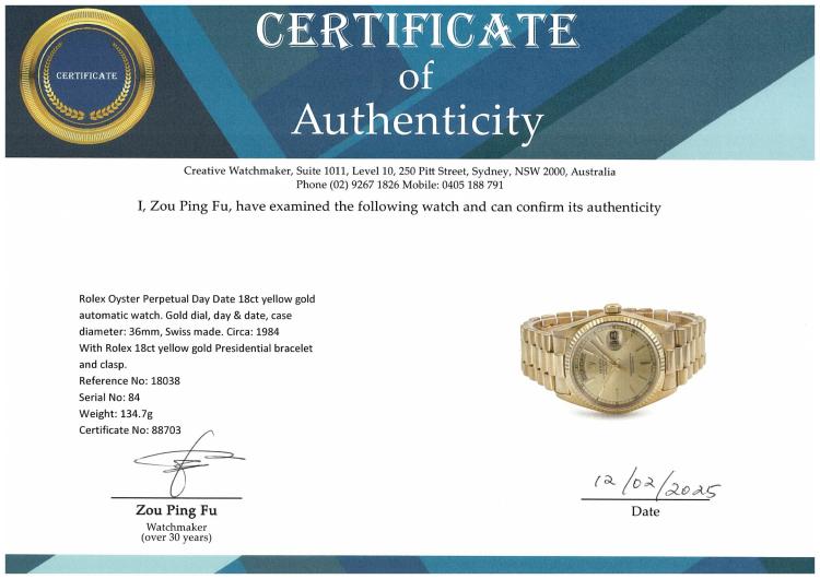 Rolex Oyster Perpetual Day Date 18ct yellow gold automatic mens watch. Gold dial, day & date, case diameter: 36mm, wrist size: 18cm, Swiss made. Ref# 18038. Circa: 1984. With Rolex 18ct yellow gold Presidential bracelet and clasp. With Certificate of Authenticity and Rolex box. 3 month FSA warranty (Pre-owned).