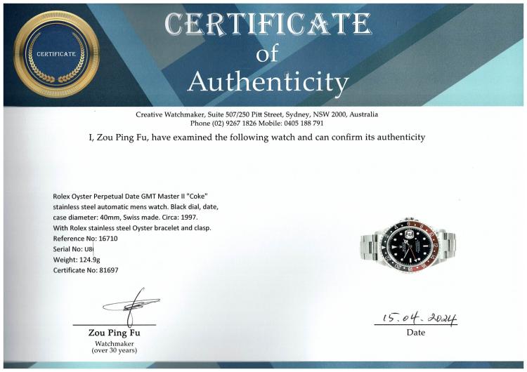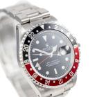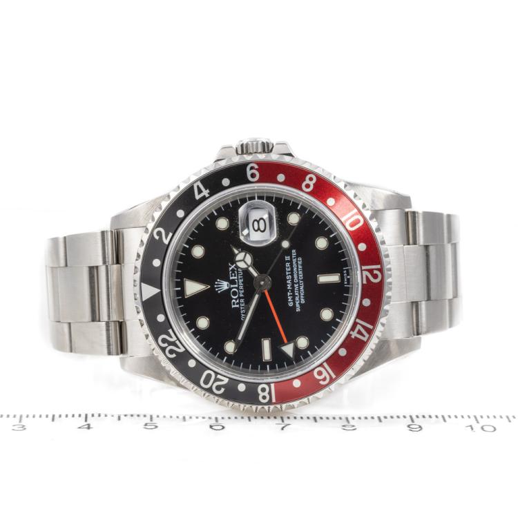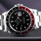 Rolex Oyster Perpetual Date GMT Master II "Coke" stainless steel automatic mens watch. Black dial, date, case diameter: 40mm, wrist size: 19cm, Swiss made. Ref# 16710. Circa: 1997. With Rolex stainless steel Oyster bracelet and clasp. With Certificate of Authenticity and Rolex box. 3 month FSA warranty (Pre-owned)