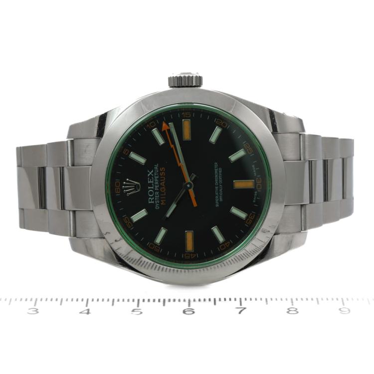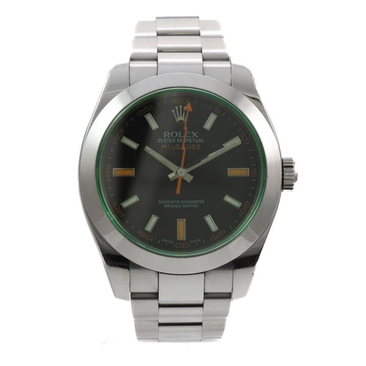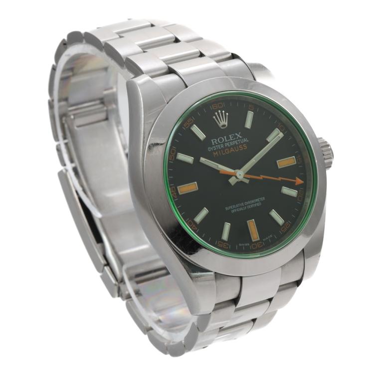 Rolex Oyster Perpetual Milgauss stainless steel automatic mens watch. Black dial, case diameter: 40mm, wrist size: 18.5cm, Swiss made. Ref# 116400GV, Circa: 2007 or 2008. With Rolex stainless steel Oyster bracelet and clasp. With Certificate of Authenticity, International Guarantee Card dated 10/11/2008 and Rolex box. 3 month FSA warranty. (Pre-owned)