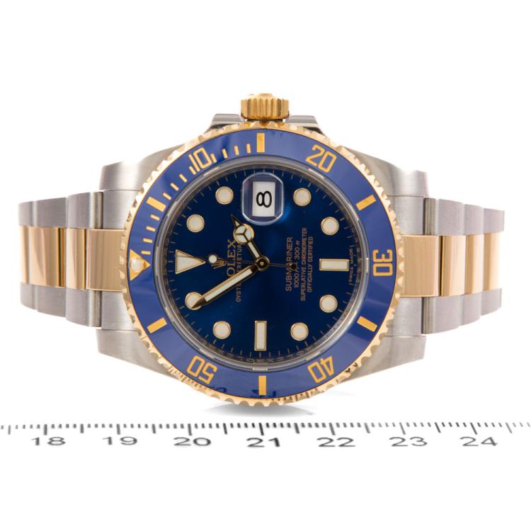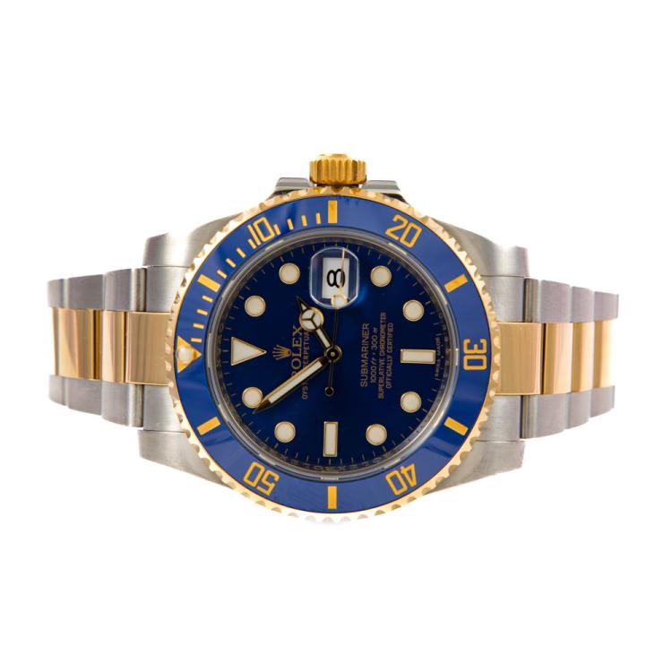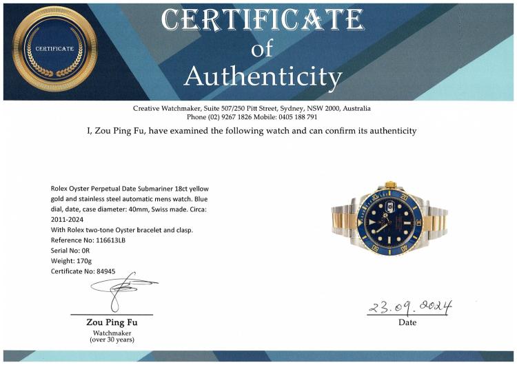 Rolex Oyster Perpetual Date Submariner 18ct yellow gold and stainless steel automatic mens watch. Blue dial, date, case diameter: 40mm, wrist size: 19.5cm, Swiss made. Ref# 116613LB. Circa: 2011-2024. With Rolex two-tone Oyster bracelet and clasp. With Certificate of Authenticity and Rolex box. 3 month FSA warranty (Pre-owned)