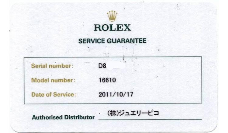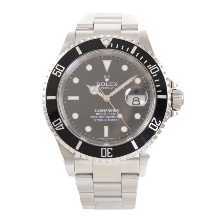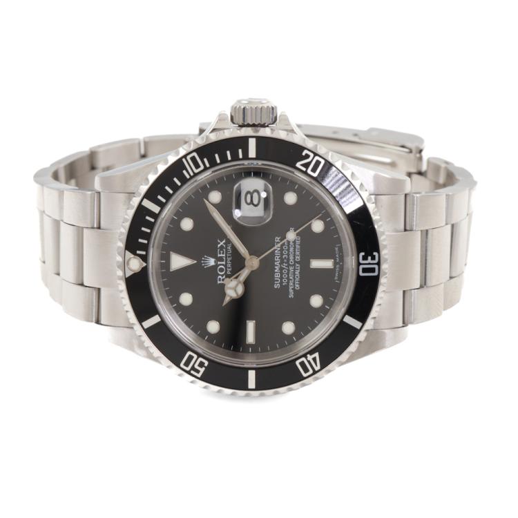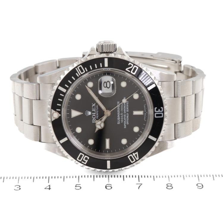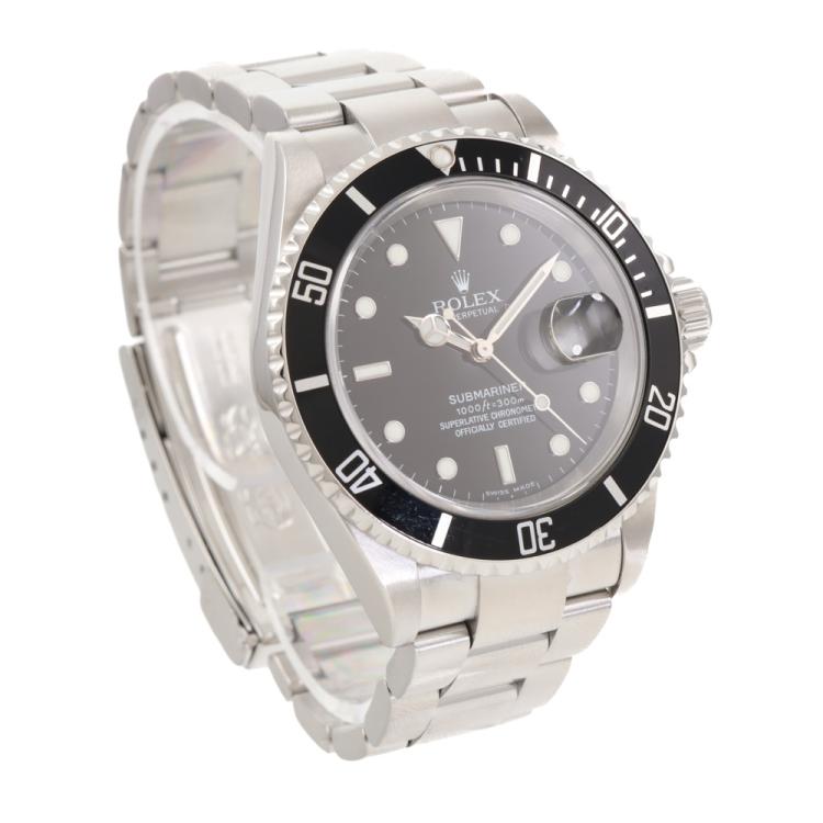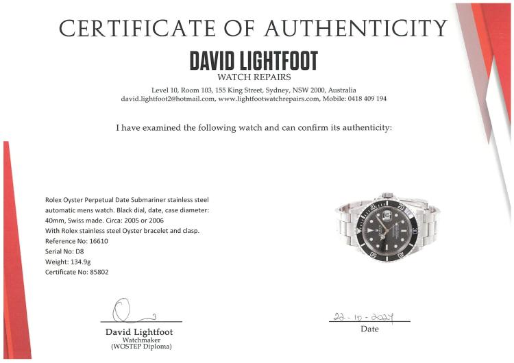 Rolex Oyster Perpetual Date Submariner stainless steel automatic mens watch. Black dial, date, case diameter: 40mm, wrist size: 18.5cm, Swiss made. Ref# 16610. Circa: 2005 or 2006. With Rolex stainless steel Oyster bracelet and clasp. With Certificate of Authenticity, Rolex International Service Guarantee Card dated 17/10/2011 and Rolex box. 3 month FSA warranty (Pre-owned)