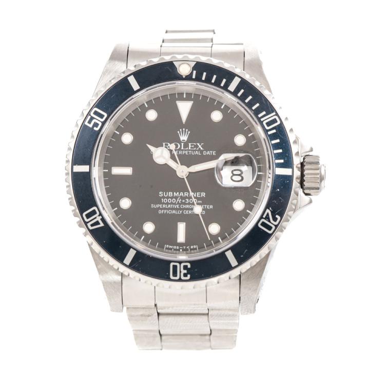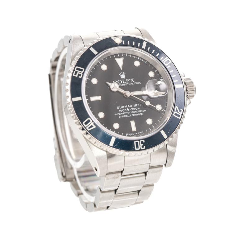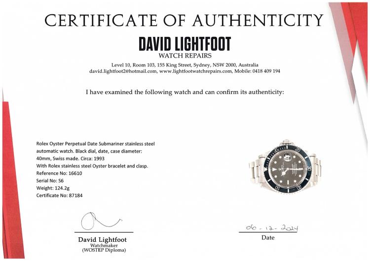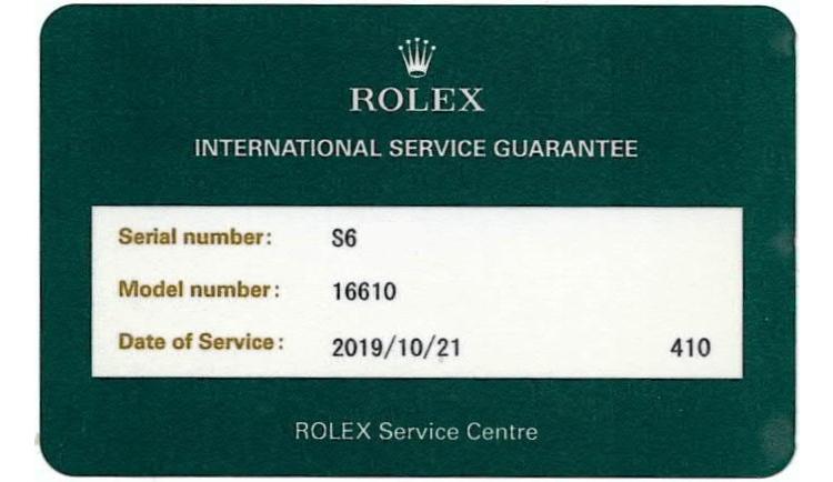 Rolex Oyster Perpetual Date Submariner stainless steel automatic mens watch. Black dial, date, case diameter: 40mm, wrist size: 17cm, Swiss made. Ref# 16610. Circa: 1993. With Rolex stainless steel Oyster bracelet and clasp. With Certificate of Authenticity, Rolex International Service Guarantee Card dated 21/10/2019 and Rolex box. 3 month FSA warranty (Pre-owned)