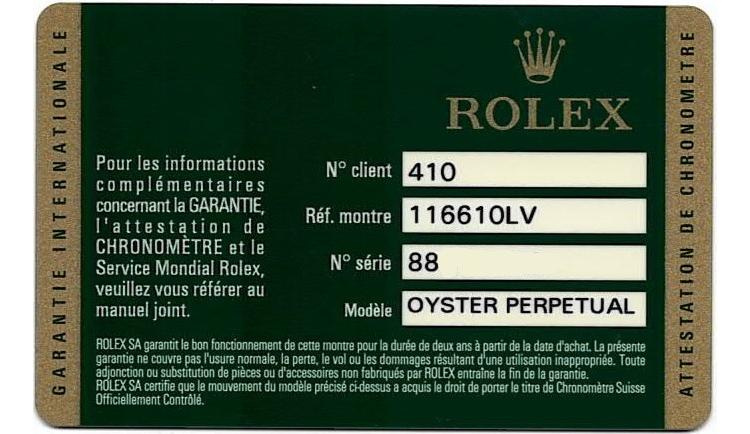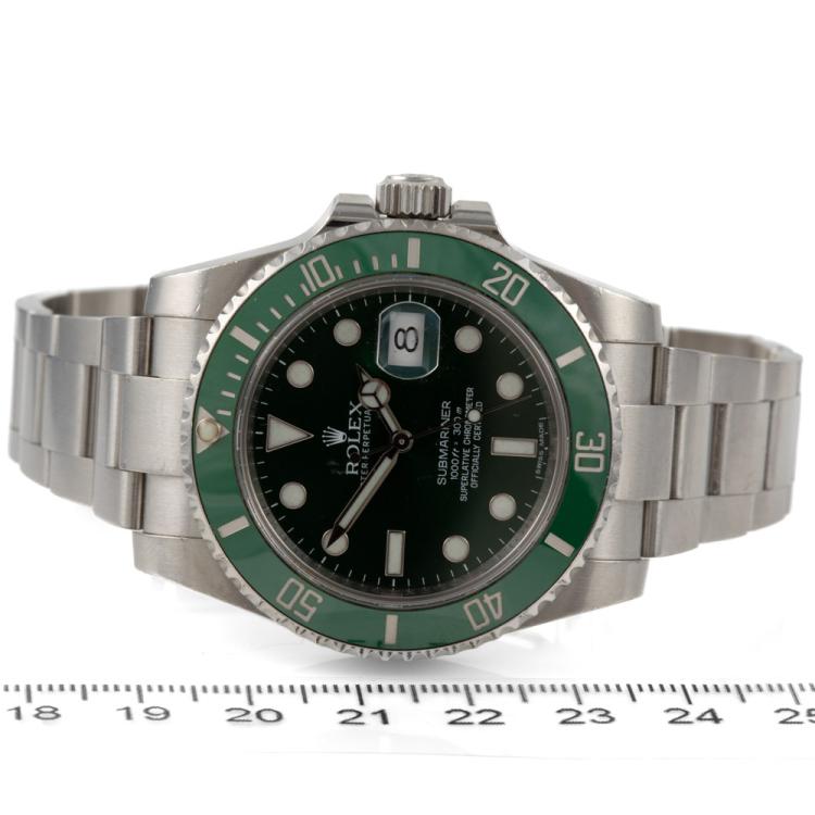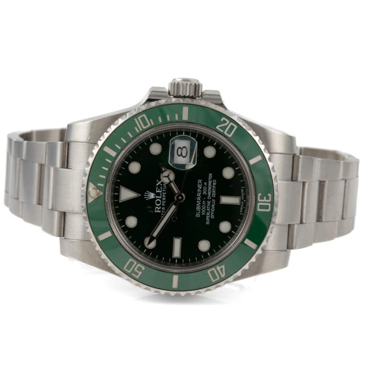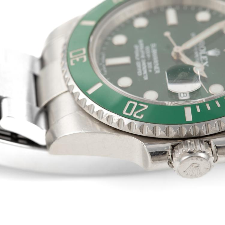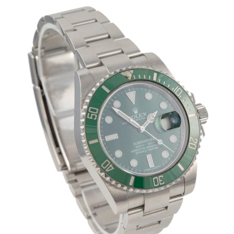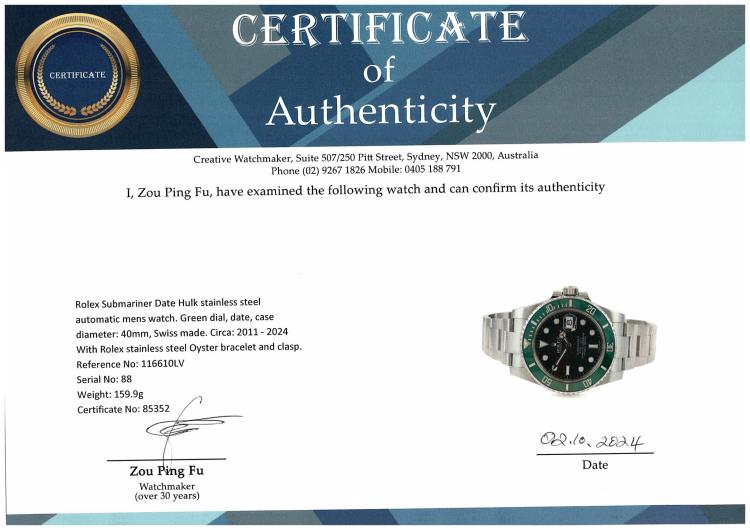 Rolex Submariner Date Hulk stainless steel automatic mens watch. Green dial, date, case diameter: 40mm, wrist size: 21.5cm, Swiss made. Ref# 116610LV. Circa: 2011 - 2024. With Rolex stainless steel Oyster bracelet and clasp. With Certificate of Authenticity, Rolex International Guarantee card dated 01/02/2013 and Rolex box. 3 month FSA warranty (Pre-owned)
