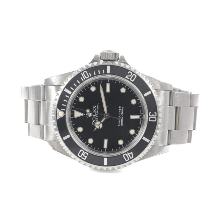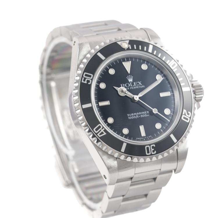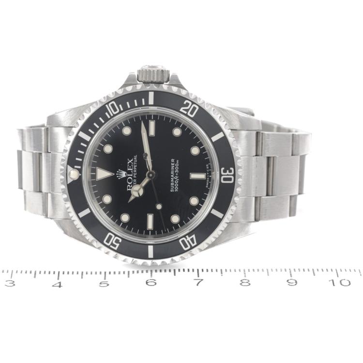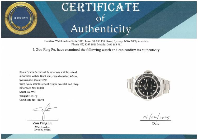Rolex Oyster Perpetual Submariner stainless steel automatic mens watch. Black dial, case diameter: 40mm, wrist size: 18cm, Swiss made. Ref #14060. Circa: 1995. With Rolex stainless steel Oyster bracelet and clasp. With Certificate of Authenticity and Rolex box. 3 month FSA warranty (Pre-owned)