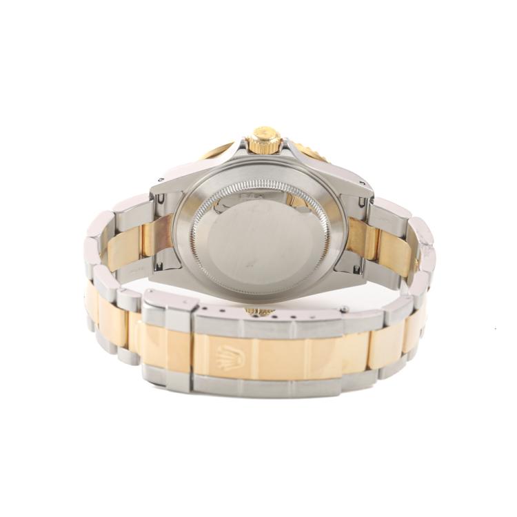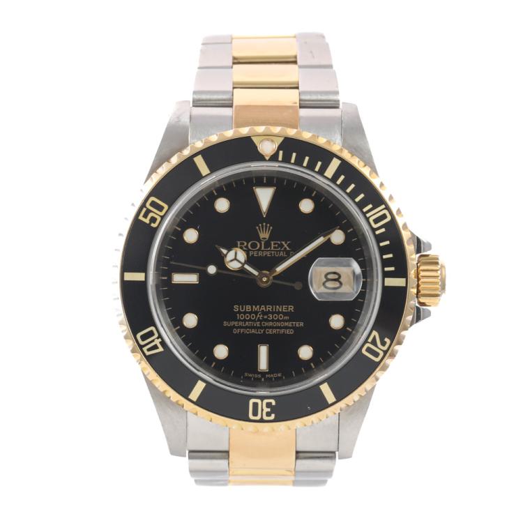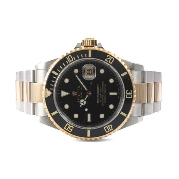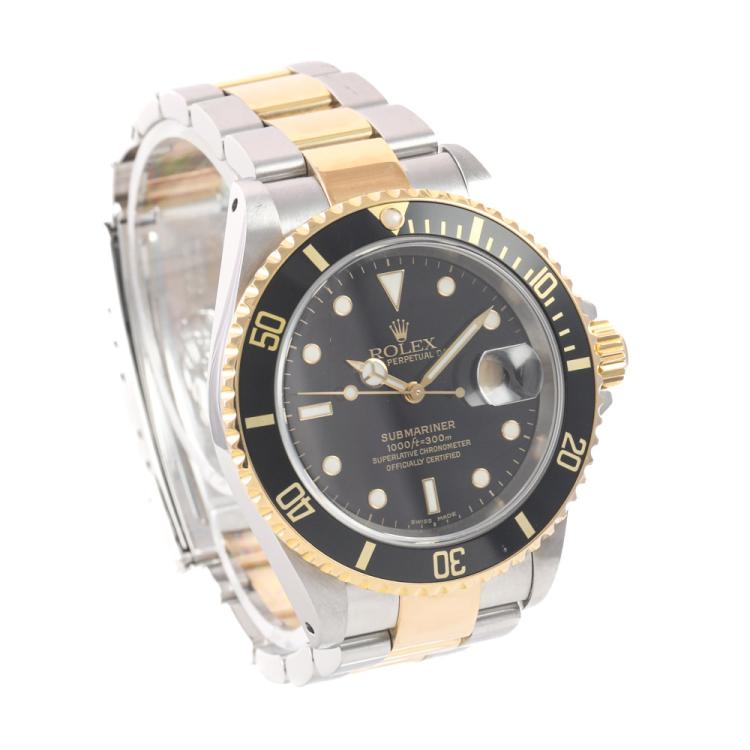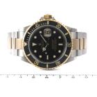 Rolex Oyster Perpetual Date Submariner 18ct yellow gold and stainless steel automatic mens watch. Black dial, date, case diameter: 40mm, wrist size: 18cm, Swiss made. Ref# 16613. Circa: 2001. With Rolex two-tone Oyster bracelet and clasp. With Certificate of Authenticity and Rolex box. 3 month FSA warranty. (Pre-owned)