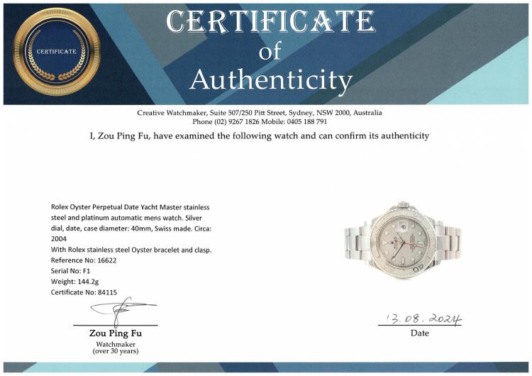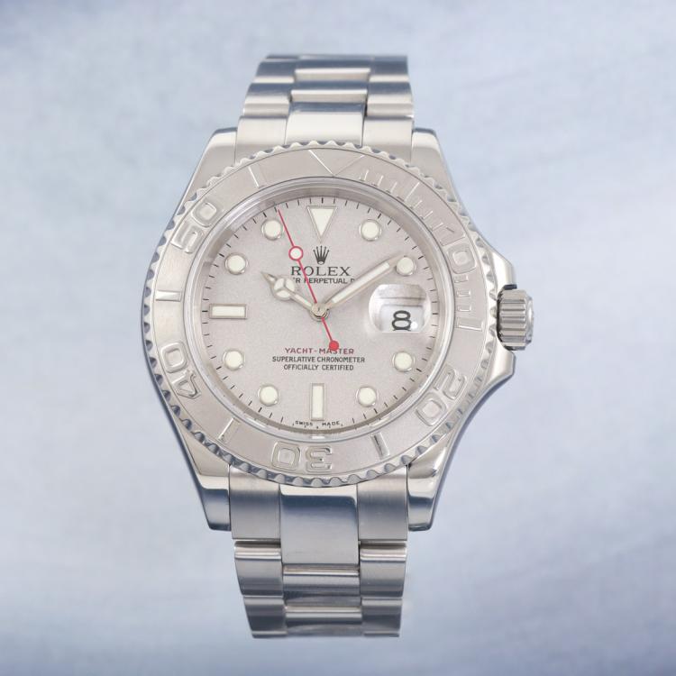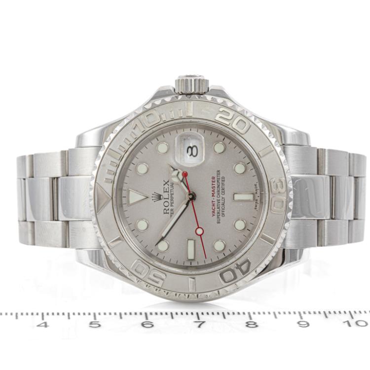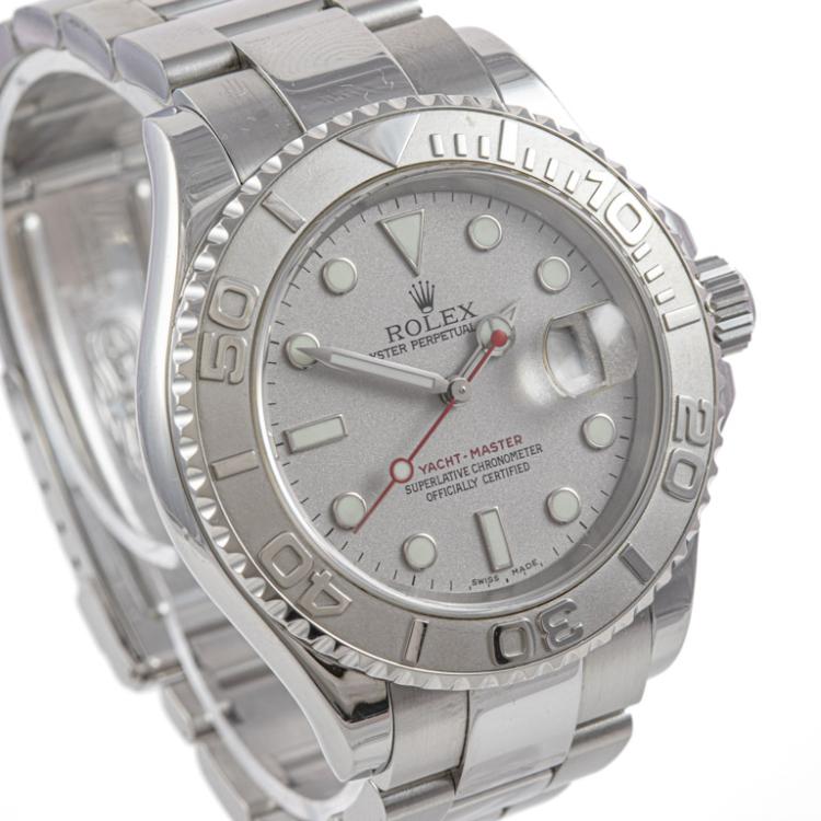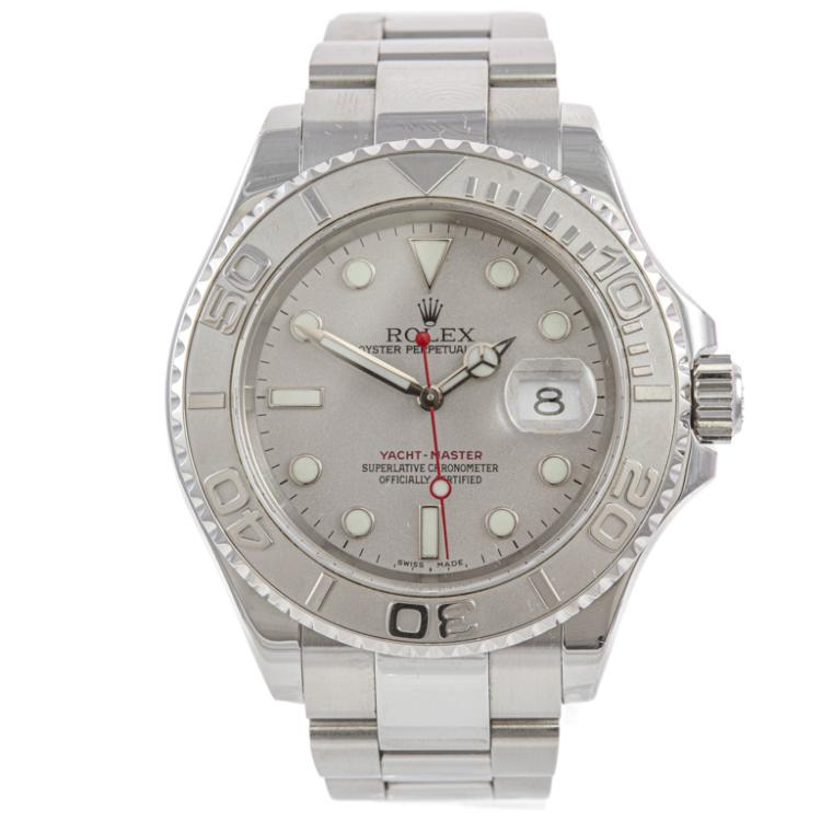 Rolex Oyster Perpetual Date Yacht Master stainless steel and platinum automatic mens watch. Silver dial, date, case diameter: 40mm, wrist size: 19cm, Swiss made. Ref# 16622. Circa: 2004. With Rolex stainless steel Oyster bracelet and clasp. With Certificate of Authenticity and Rolex box. 3 month FSA warranty. (Pre-owned)