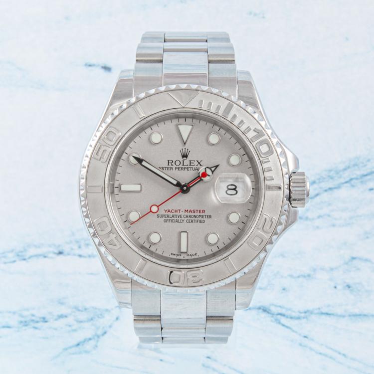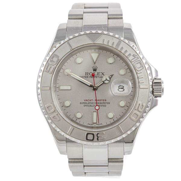 Rolex Oyster Perpetual Date Yacht Master stainless steel and platinum automatic mens watch. Silver dial, date, case diameter: 40mm, wrist size: 17.5cm, Swiss made. Ref #16622. Circa: 2004. With Rolex stainless steel Oyster bracelet and clasp. With Certificate of Authenticity and Rolex box. 3 month FSA warranty. (Pre-owned)