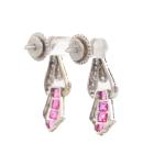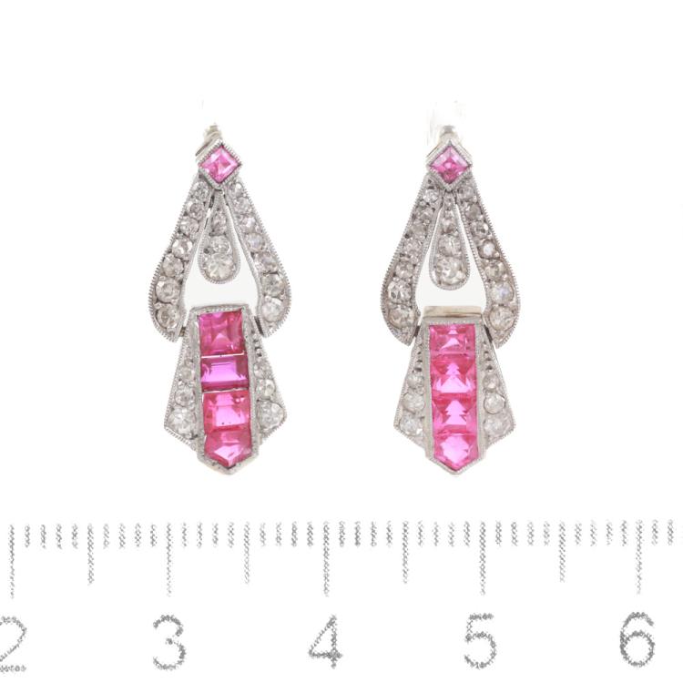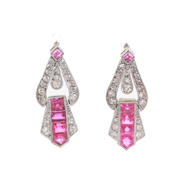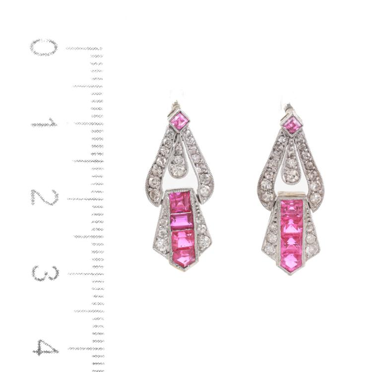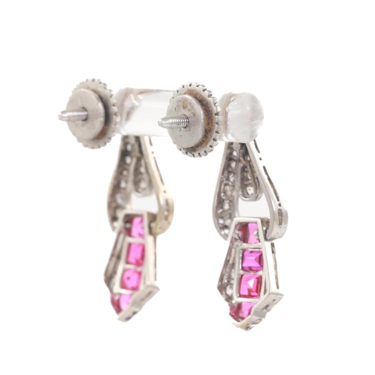 Ruby and Diamond Art Deco earrings with shield shape, carre baguette cut Natural rubies totalling approximately 0.90ct and round Natural Diamonds totalling approximately 0.30ct (Estimated grading: H-I SI). 14ct white gold setting with platinum 950 posts & butterflies (XRF tested, stamped 18ct). Weight: 5.0g. (Pre-owned)