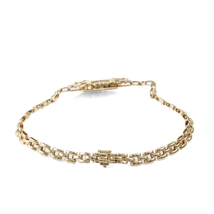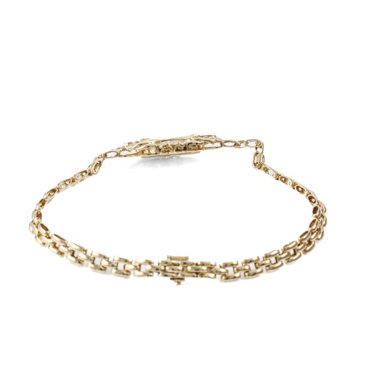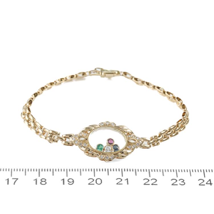 Ruby, Sapphire, Emerald and Diamond bracelet with floating round Natural Ruby, round Natural blue Sapphire, round Natural Emerald and round Natural Diamond totalling 0.24ct. Rest round Natural Diamonds totalling 0.20ct. 18ct yellow gold. Length: 18cm. Weight: 11.6g. (Pre-owned)