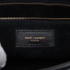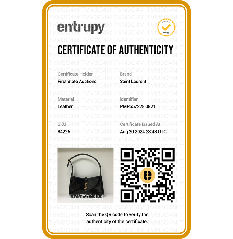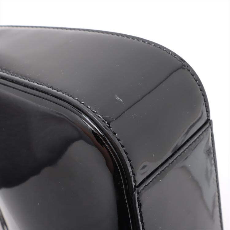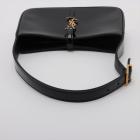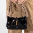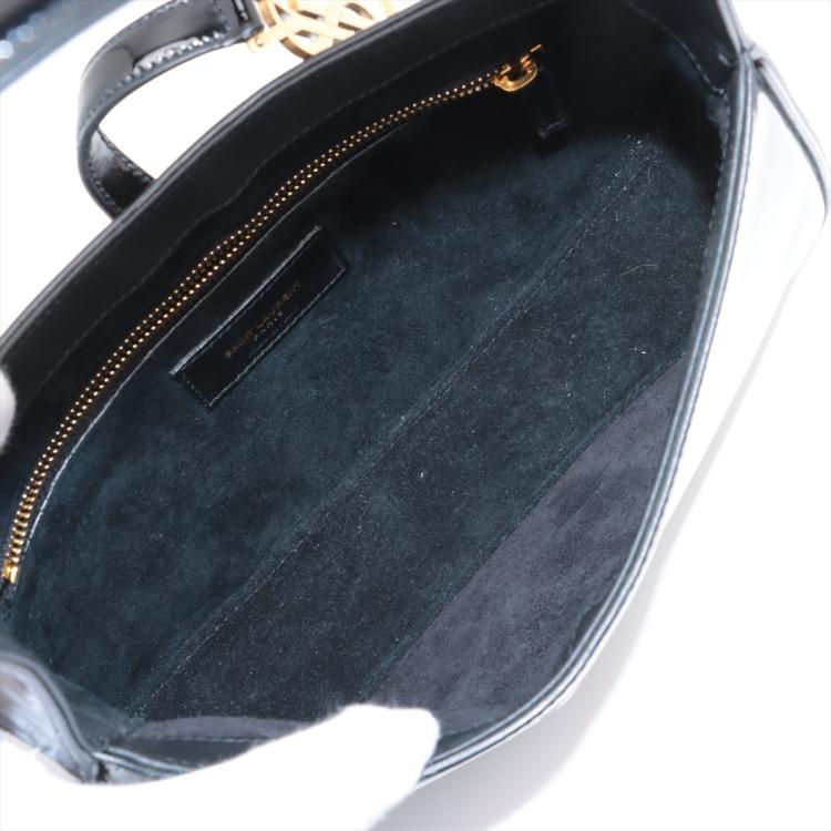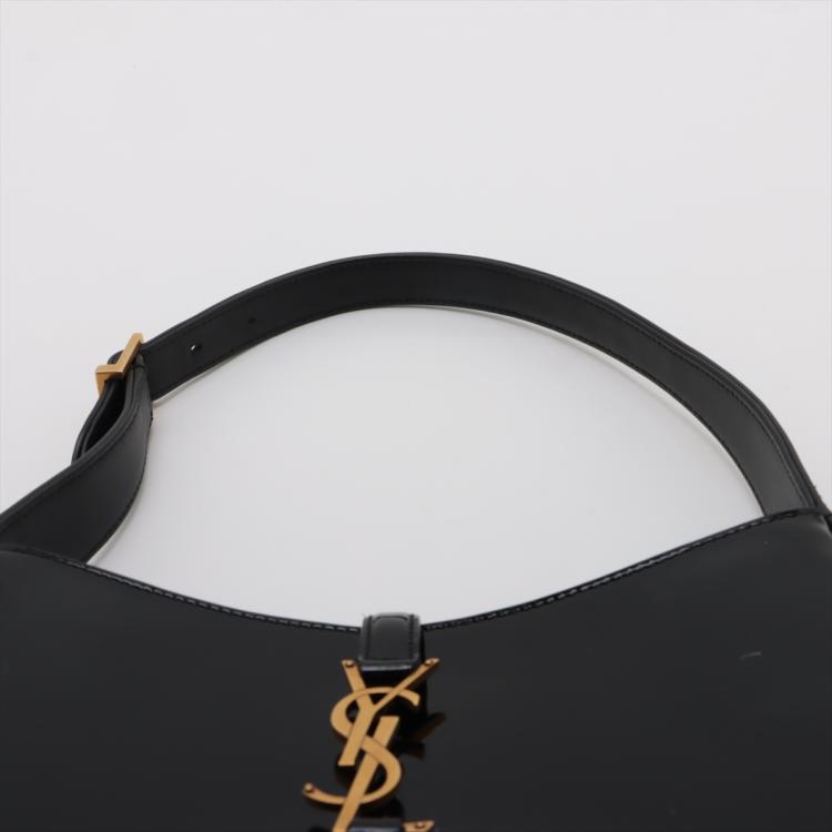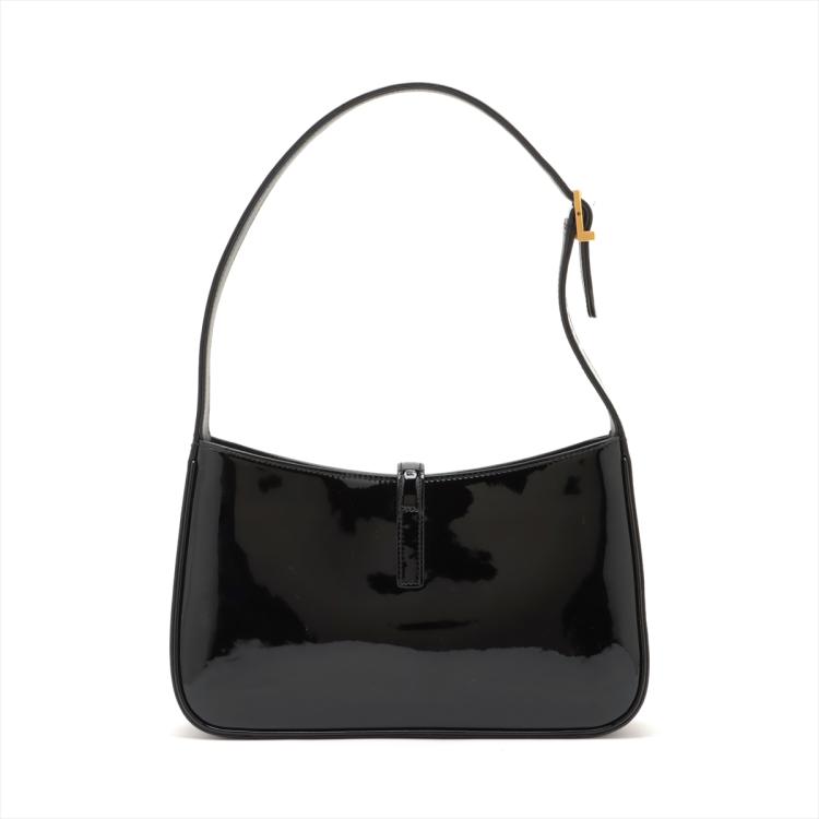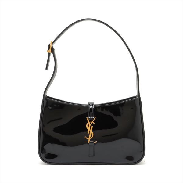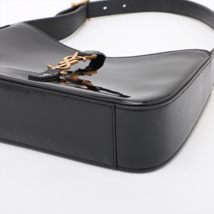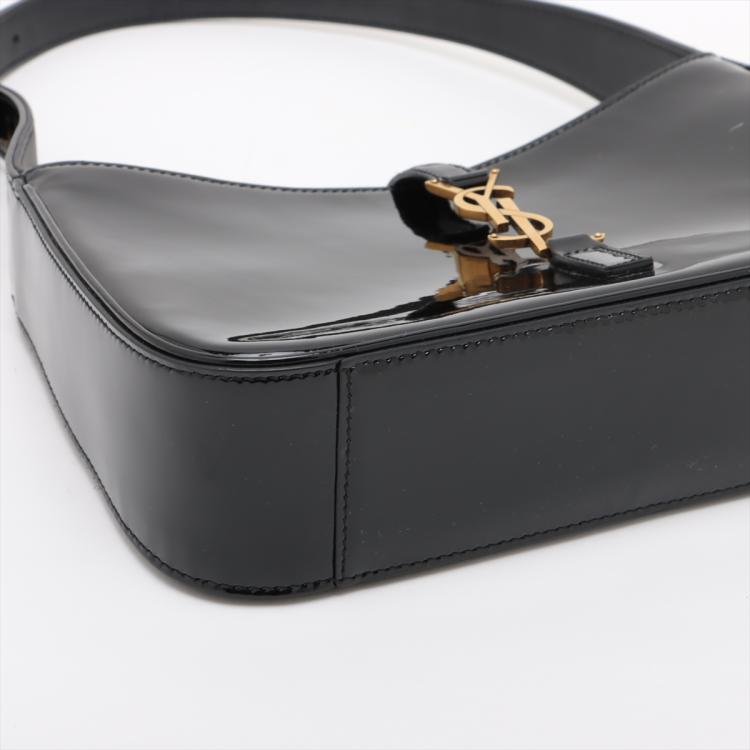 Saint Lauren Le 5 A 7 hobo bag in black patent leather. Featuring aged gold-toned hardware, adjustable shoulder strap, and "YSL" logo clasp at front. The logo hook closure opens to a black suede lining with a zipper pocket. Approximate dimensions: 24.5cm(L) x 15.5cm(H) x 6cm(D), strap drop 21.5cm. With Entrupy Certificate of Authenticity. (Pre-owned)