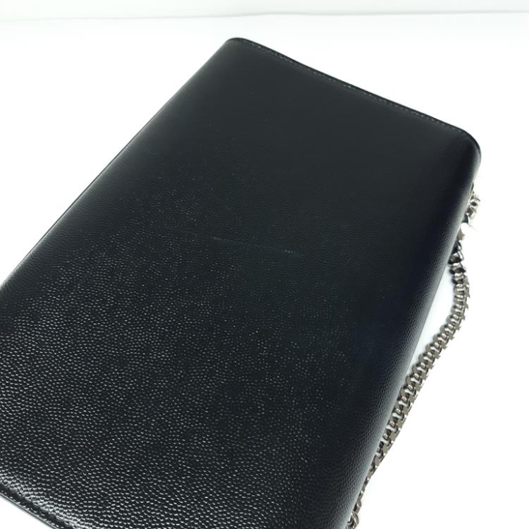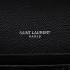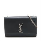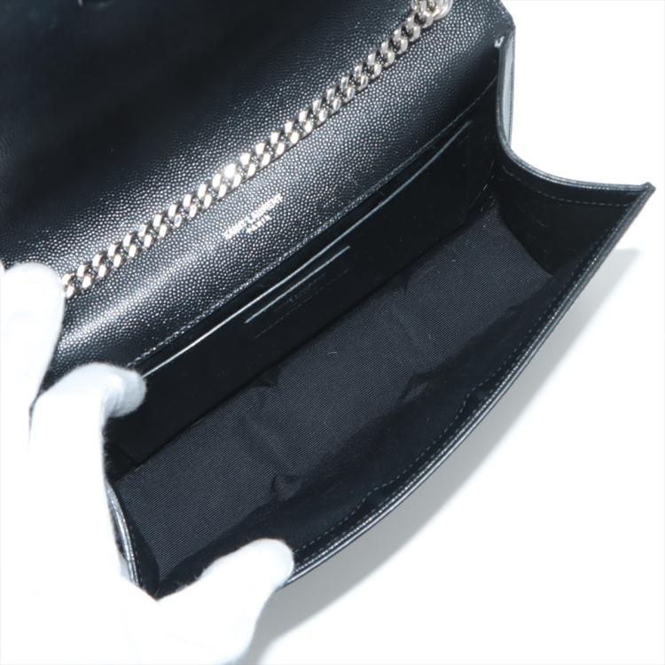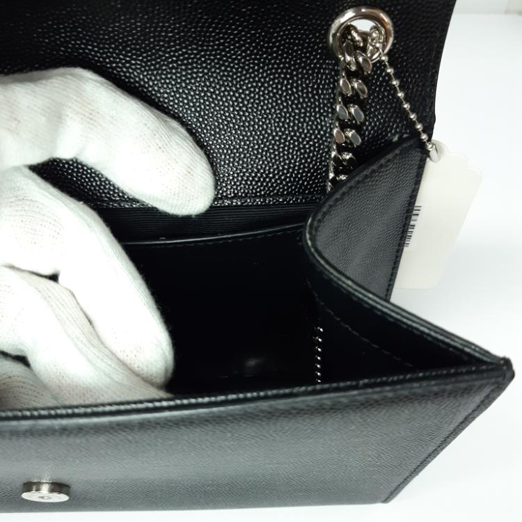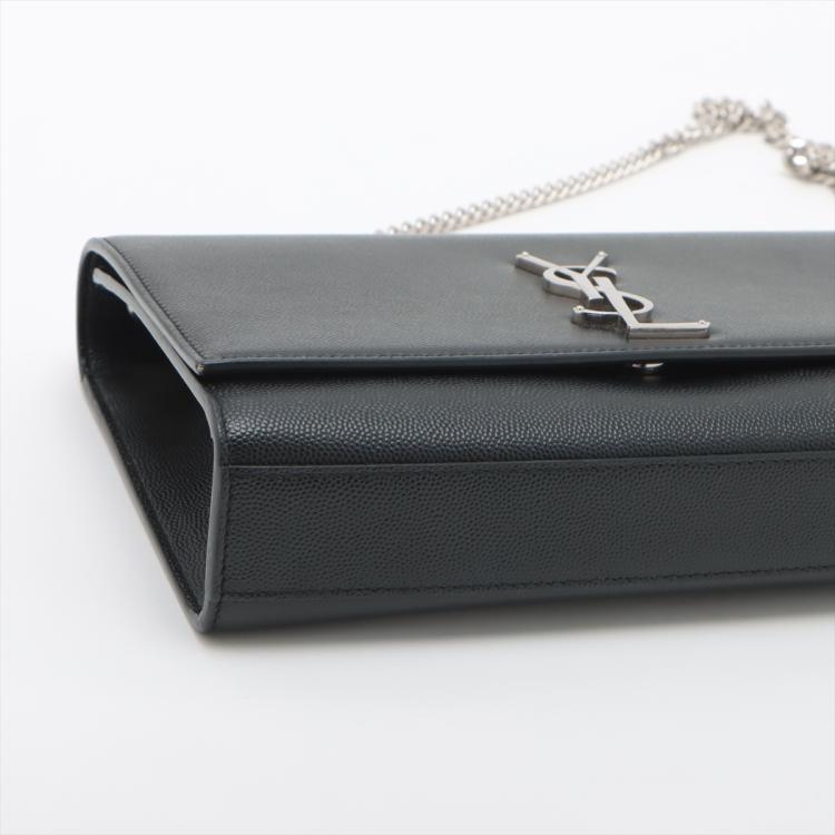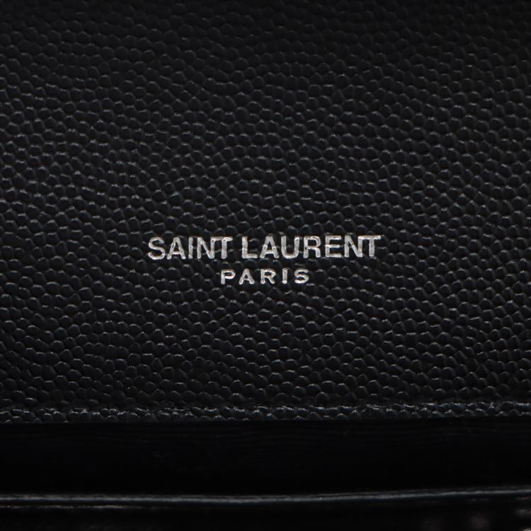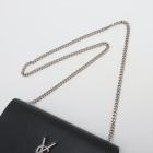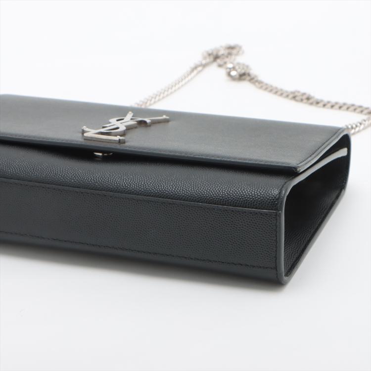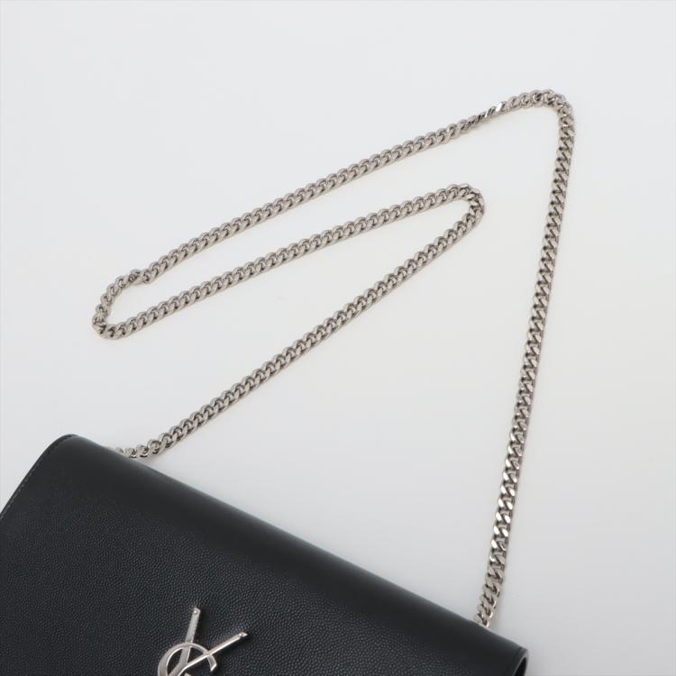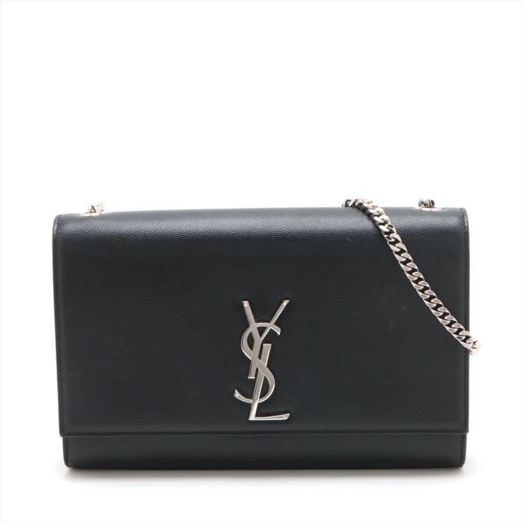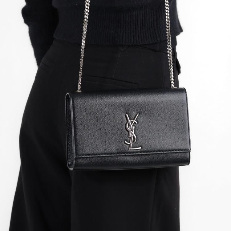 Saint Laurent medium Kate shoulder bag in black grainy leather. Featuring silver-toned hardware, fold over flap with 'YSL' logo plaque, and with magnetic snap closure at front. This opens to a black fabric interior with a patch pocket. Approximate dimensions: 24cm(L) x 15.5cm(H) x 5.5cm(D), strap drop 49.5cm. With Entrupy Certificate of Authenticity. (Pre-owned)