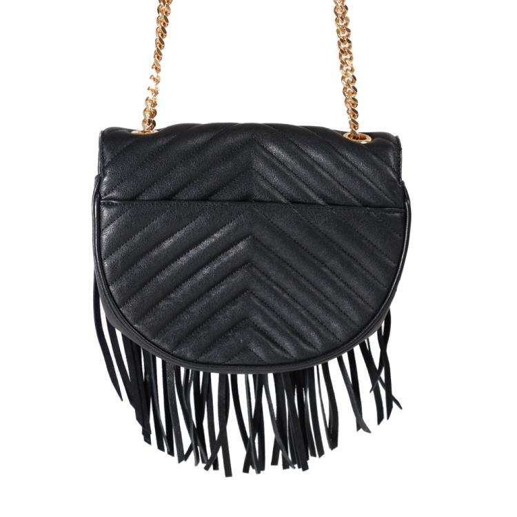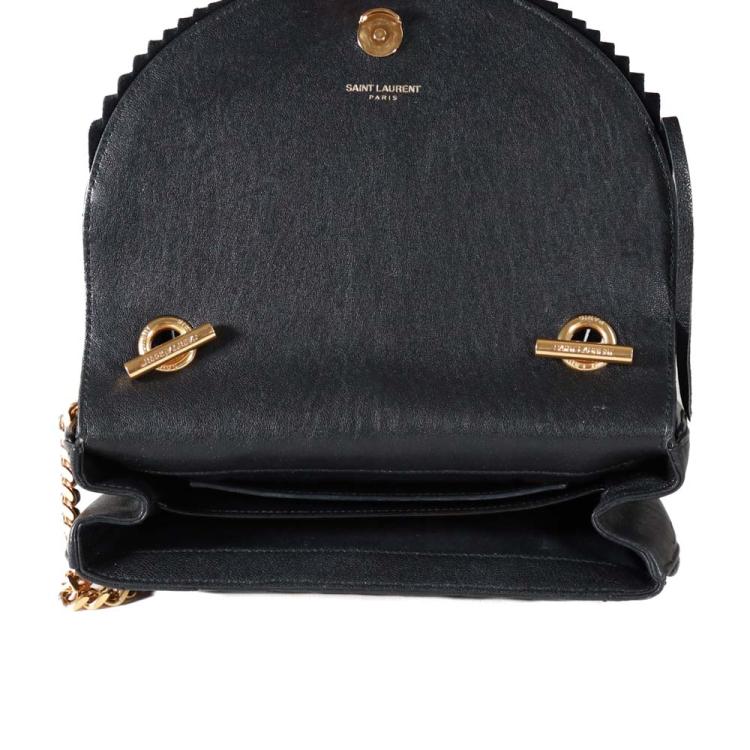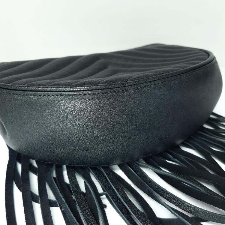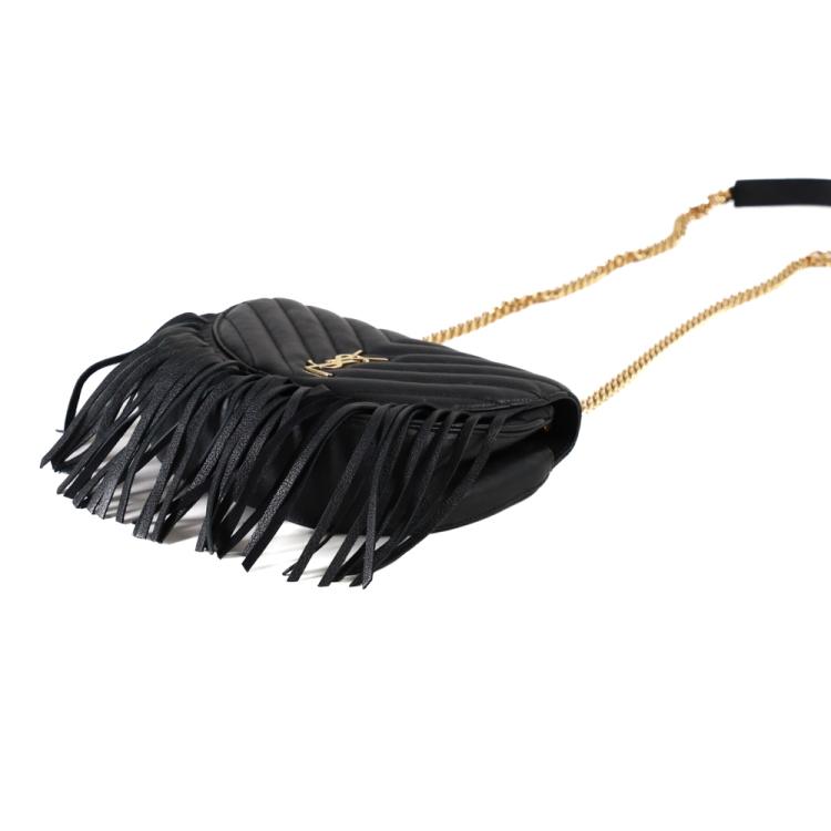 Saint Laurent Monogram Fringe half-moon shape crossbody bag in black calfskin leather. Featuring gold-toned hardware, rear exterior patch pocket, front flap with suede-leather fringe, and detachable chain shoulder strap. The magnetic closure opens to a black textile interior with patch pockets. Approximate dimensions: 21cm(L) x 16cm(H) x 6cm(D), strap drop 47cm. Accompanied by YSL dustbag. With Entrupy Certificate of Authenticity. (Pre-owned)