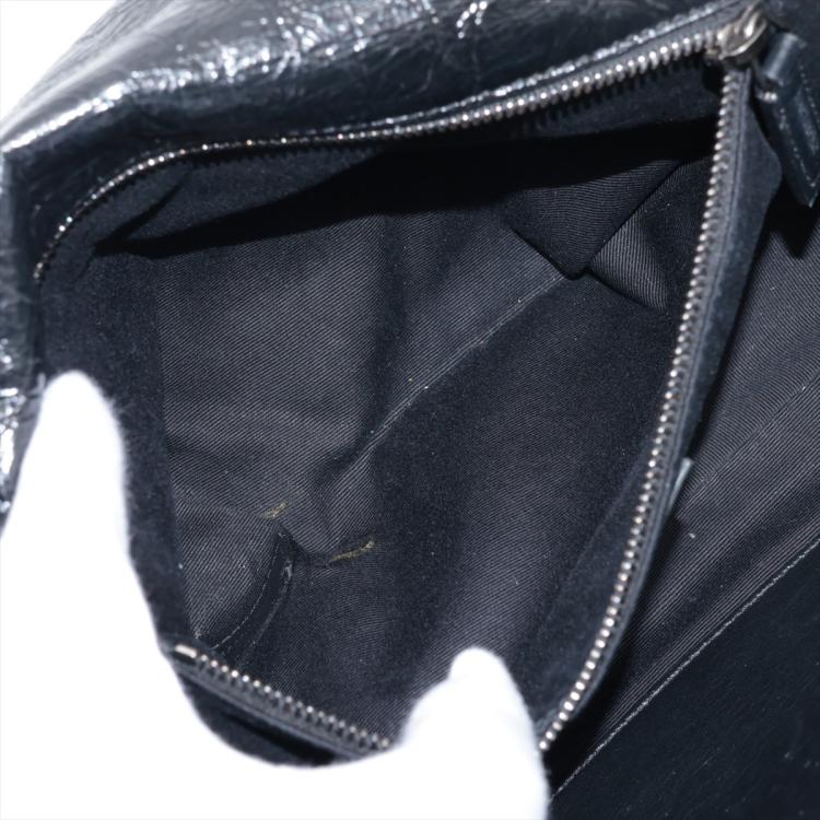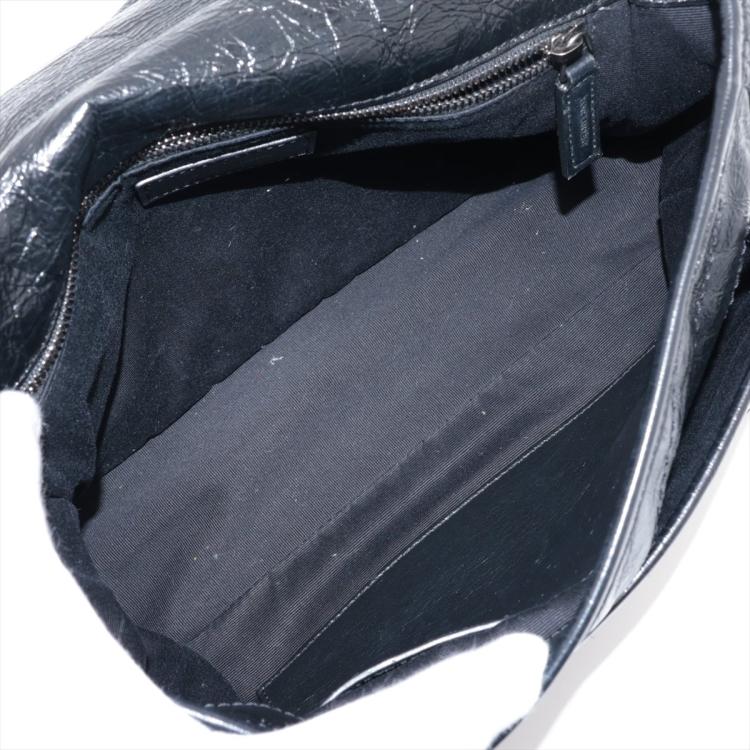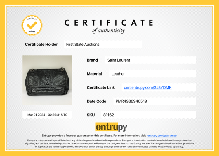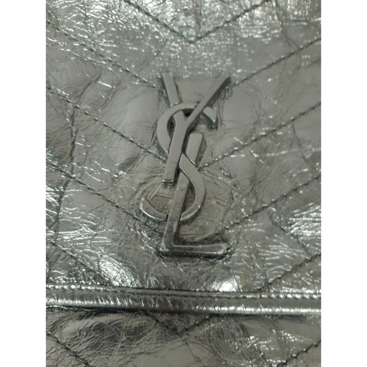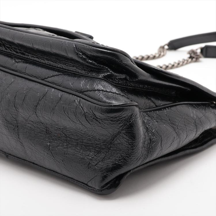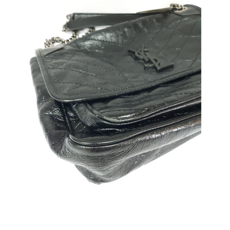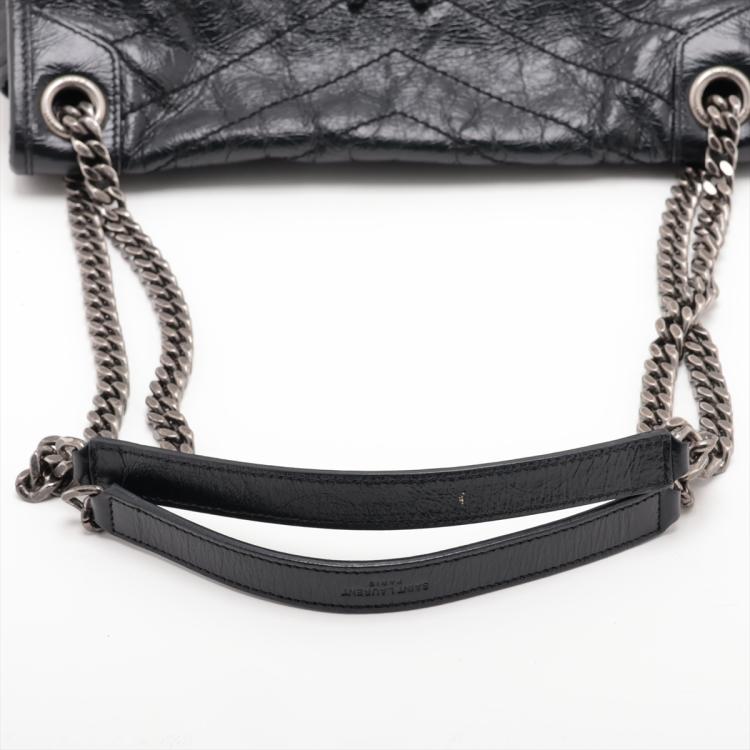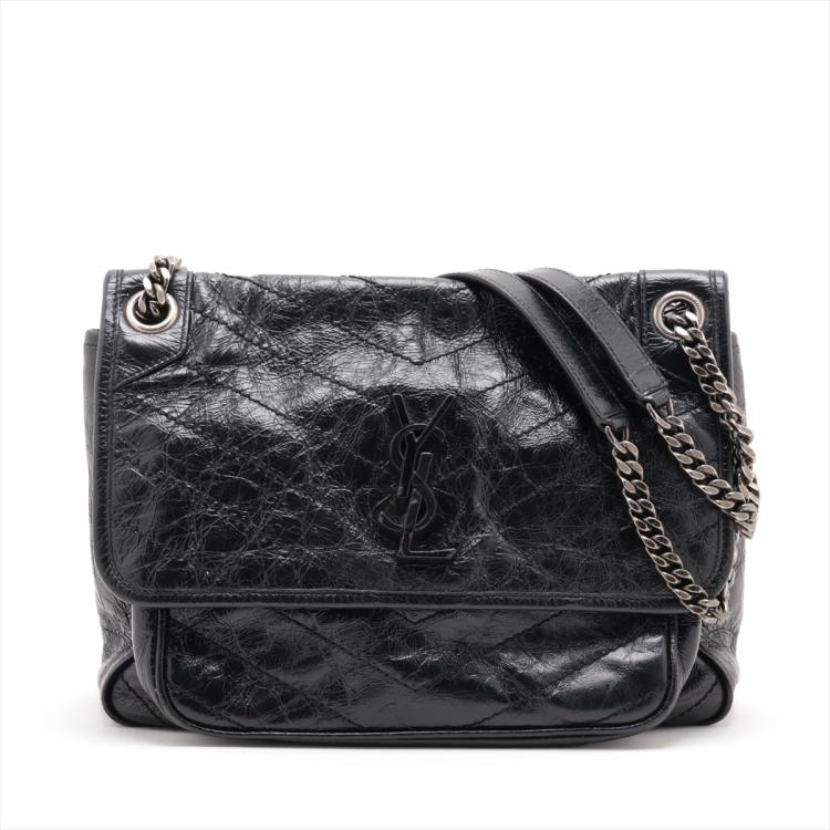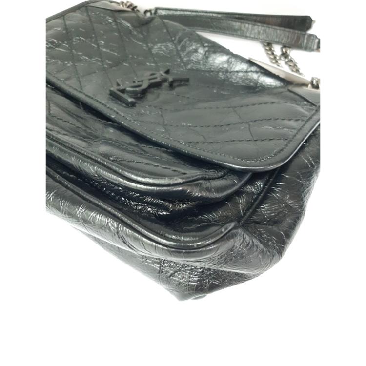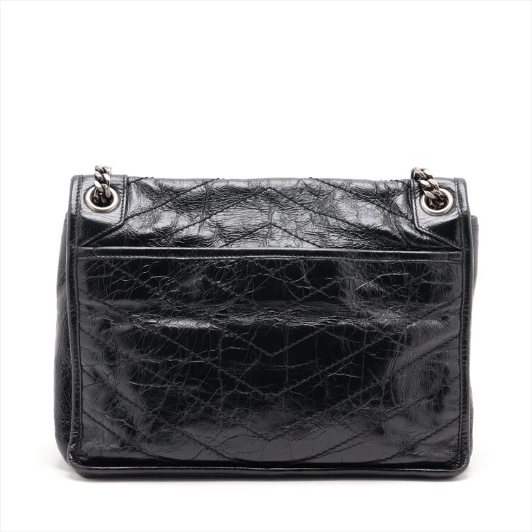 Saint Laurent medium Niki chain bag in black textured calfskin. Featuring chevron stitches, metal black tone hardware, two external pockets under flap and at rear, front flap with black leather YSL logo detail and magnetic closure. It opens to a fabric lining interior with zipped and patch pockets. Approximate dimensions: 28cm(L) x 20cm(H) x 10cm(D) and 29cm double chain drop. Accompanied by a YSL dust bag. With Entrupy Certificate of Authenticity. (Pre-owned)