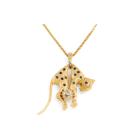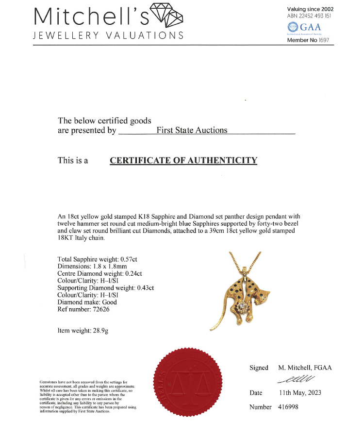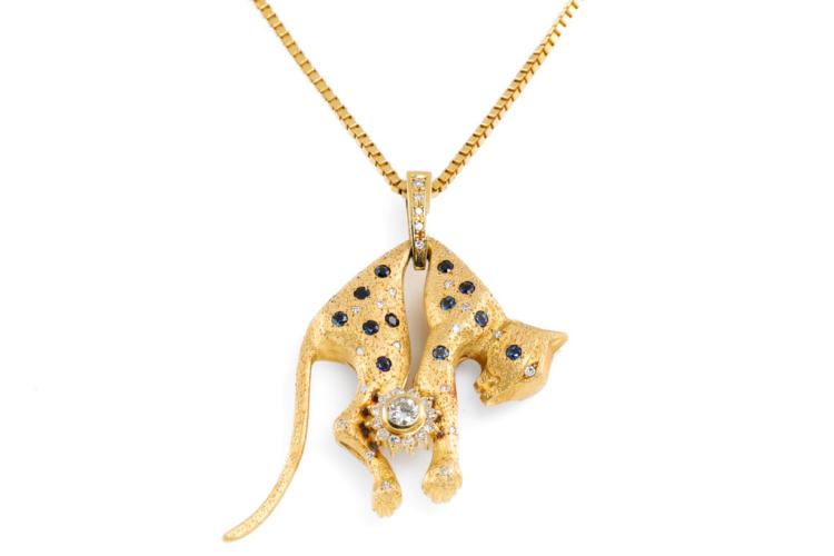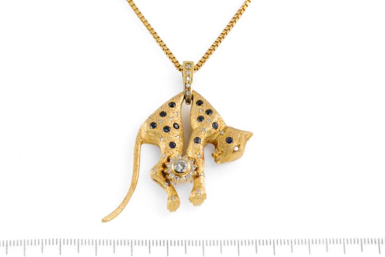 Sapphire and Diamond panther design pendant with round blue Natural Sapphires totalling 0.57ct, a round Natural Diamond of 0.24ct and remaining round Diamonds totalling 0.43ct (Estimated grading for all Diamonds: H-I SI). 18ct yellow gold with 39cm 18ct yellow gold chain. Weight: 28.9g. With certificate #416998. (Pre-owned)