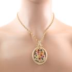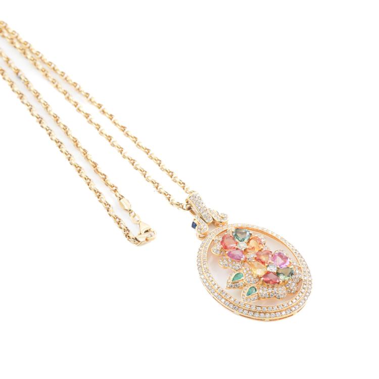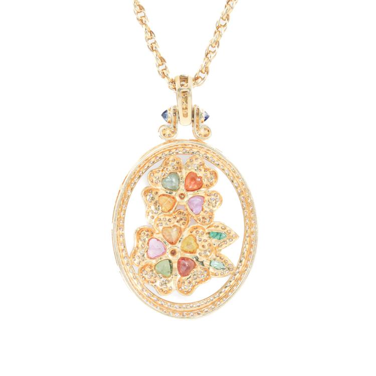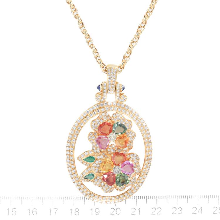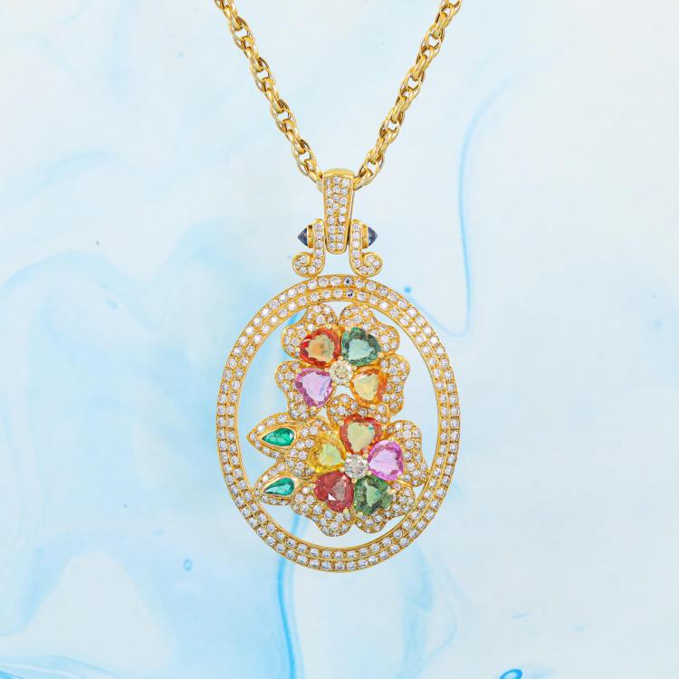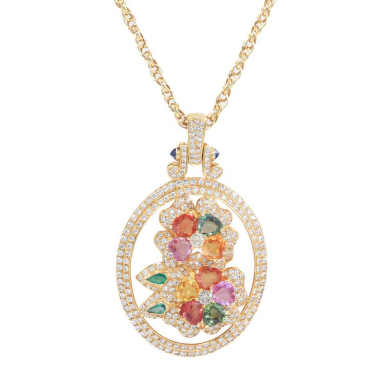 Mixed Gemstone & Diamond pendant with heart shape multicolour (including orange, pink, green and golden) Natural Sapphires totalling approximately 9.00ct (7x7mm), pear shape Natural Emeralds totalling approximately 0.30ct (5x3mm), 2 rose cut Natural Blue Sapphires of approximately size 3mm and round Natural Diamonds totalling approximately 4.20ct (estimated grading: H-I SI). 18ct yellow gold with 65cm 18ct yellow gold chain. Weight: 33.1g. With Certificate #419895. (Pre-owned)