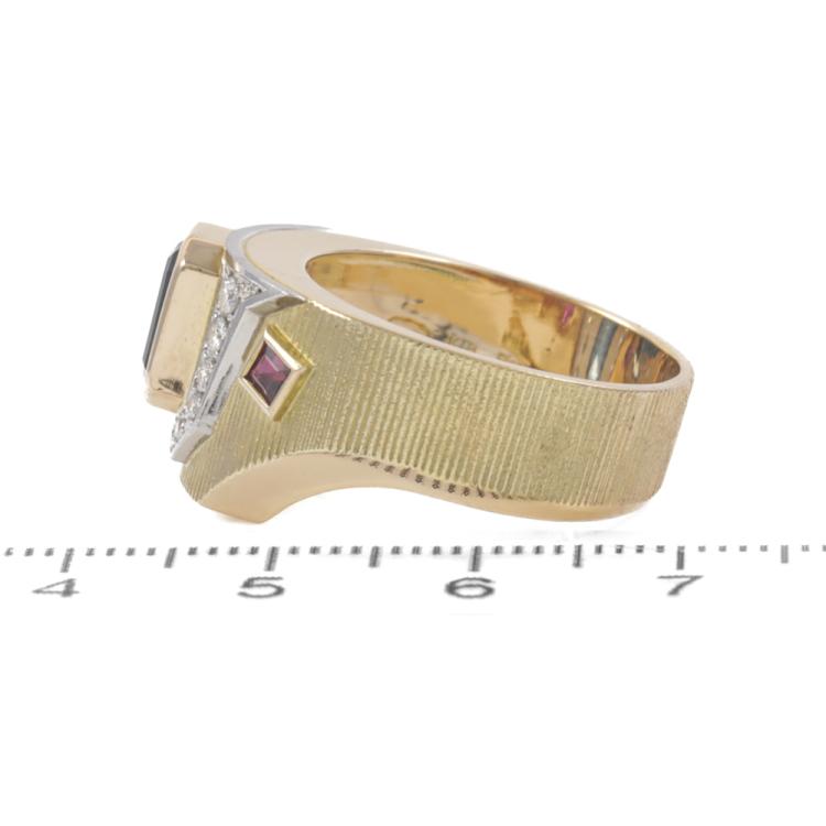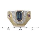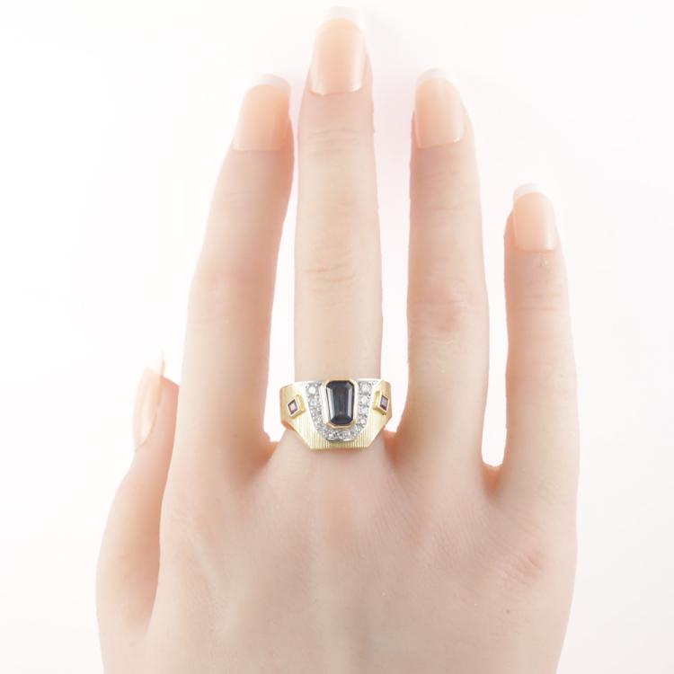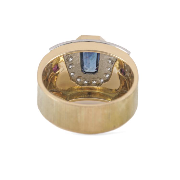 Sapphire, Ruby and Diamond ring with emerald cut Natural Blue Sapphire of 2.17ct, square Natural Rubies totalling 0.24ct and round Natural Diamonds totalling 0.22ct. 18ct yellow gold & Platinum - 900. Ring size P½. Band width: 7.7mm - 7.1mm. Weight: 11.2g. (Pre-owned)