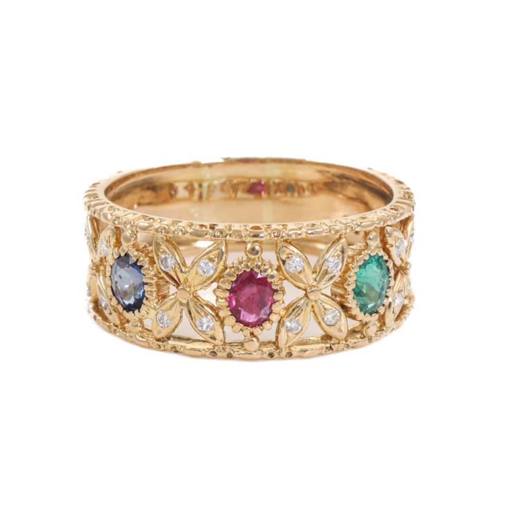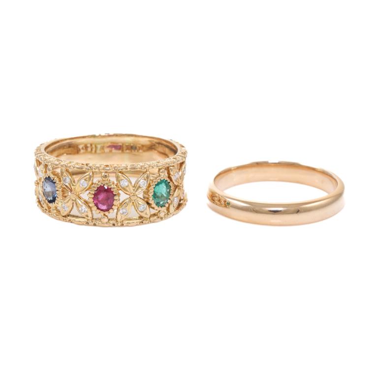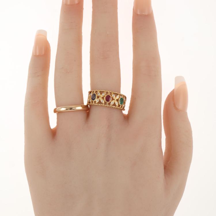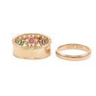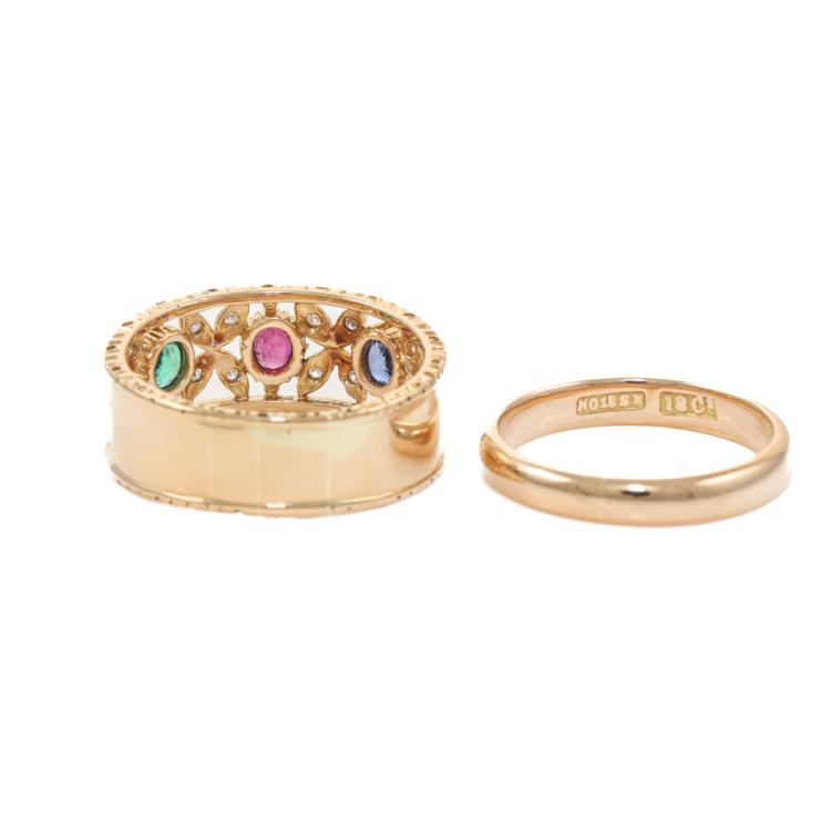Set of 2 rings. 1) Mixed gemstone ring with oval shape blue Natural Sapphire, Ruby and Emerald measuring approximately 3.6mm x 2.7mm & round Natural Diamonds totalling approximately 0.08ct. 18ct yellow gold. Ring size O1/2. Band width: 6.6mm-7.6mm. 2) 18ct rose gold band ring. Ring size M. Band width: 3.2mm. Combined weight: 9.4g. (Pre-owned)