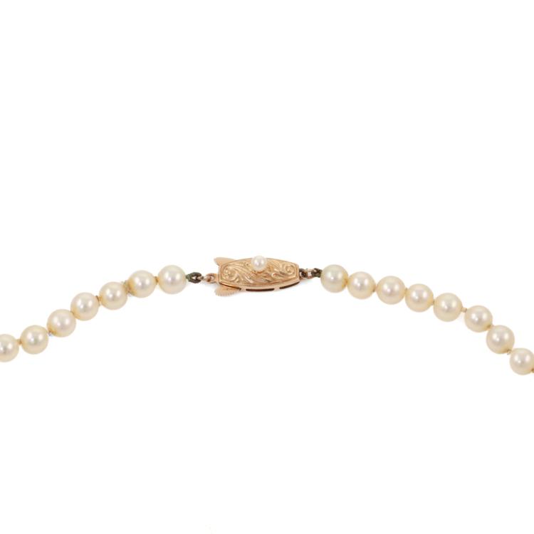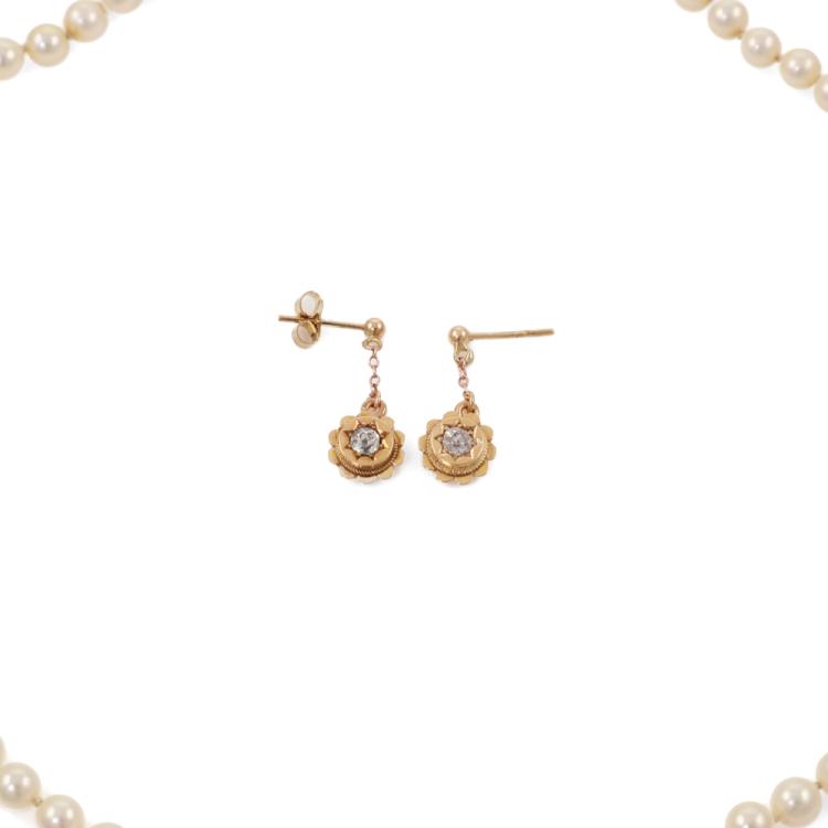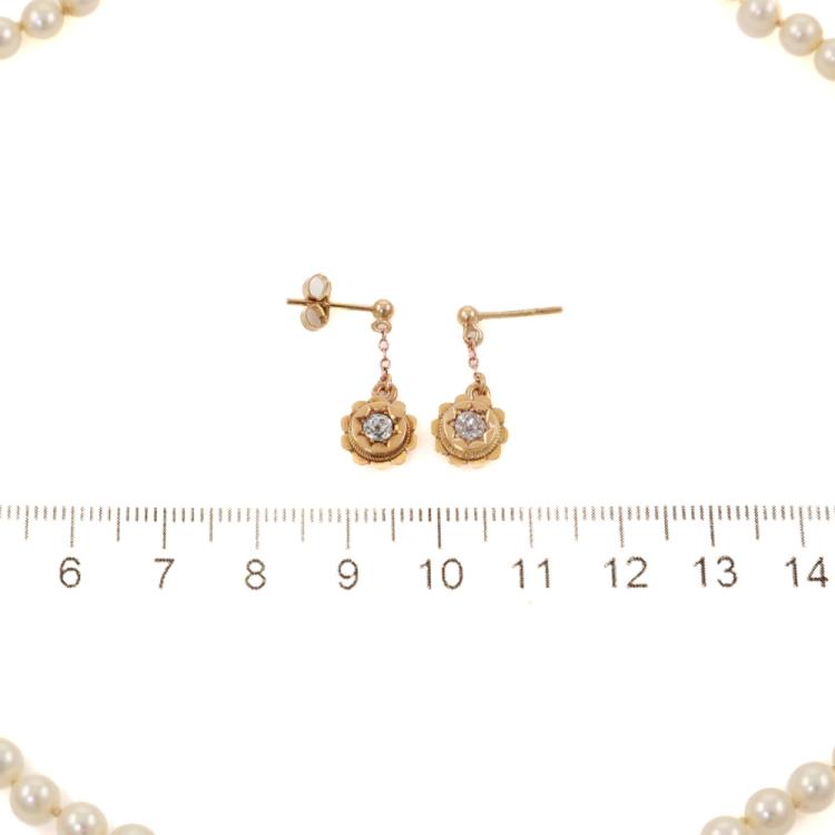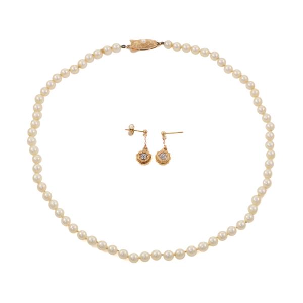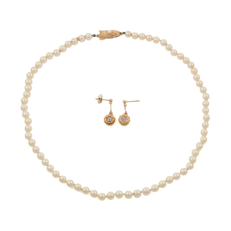 Set of jewellery comprised of one Pearl necklace of 68 Akoya Pearls measuring 4.8mm - 5.3mm and 0.30 ct Natural Diamond and yellow gold flower drop earrings. 14ct yellow gold clasp and 10ct yellow gold earrings. Necklace length: 41 cm, Drop length: 2cm. Weight: 17.2g. (Pre-owned)