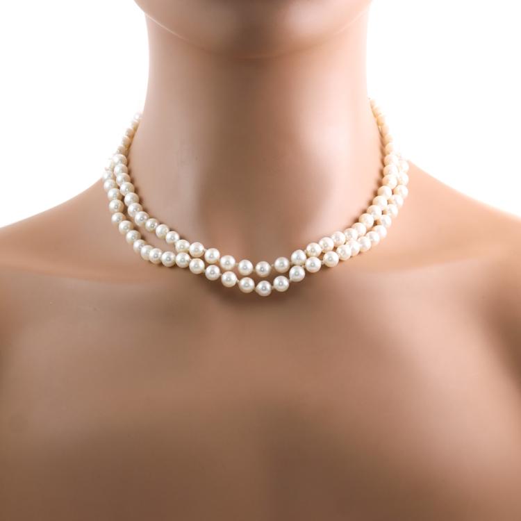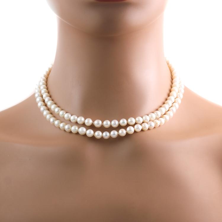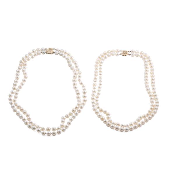 Set of 2 double-row Akoya Pearl necklaces. 1) Double-row necklace with 116 Akoya pearls of 6.1 - 6.4mm. 14ct yellow gold box clasp. Length: 40cm. 2) Double-row necklace with 115 Akoya Pearls of 6.0mm - 6.3mm. 14ct yellow gold box clasp. Length: 42cm. Total Weight: 83.5g. (Pre-owned)