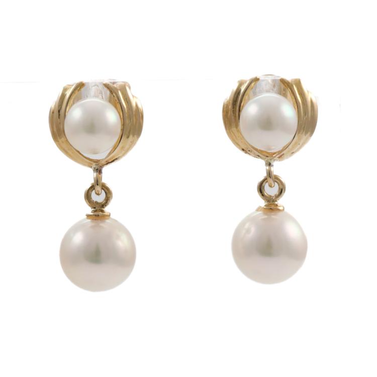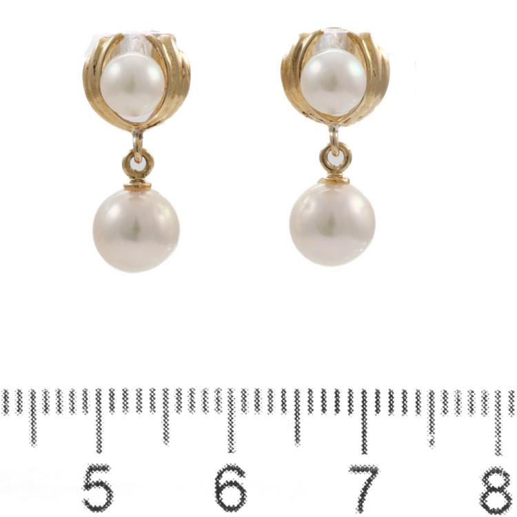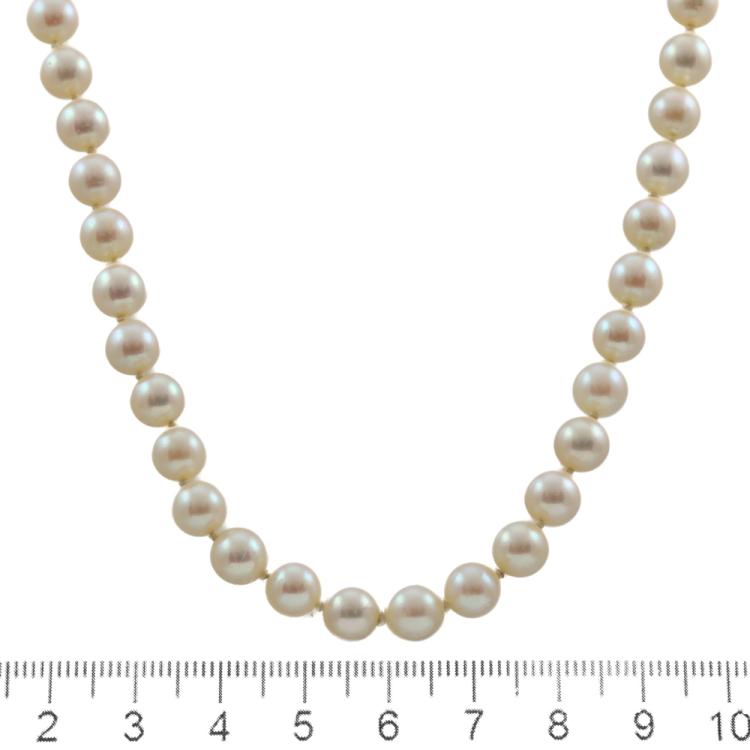 Set of Pearl necklace and earrings. 1) Pearl necklace with 54 Akoya Pearls of 6.5 - 6.9mm. 14ct yellow gold clasp set with a seed Pearl of 3mm. Length: 42cm. 2) Pearl drop earrings with Akoya Pearls of 4.8mm & 6.6mm. 18ct yellow gold. Drop length: 1.8cm. Total Weight: 26.2g. (Pre-owned)