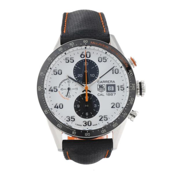 TAG Heuer Carrera 40th Anniversary of McLaren's Limited Edition of 1974 stainless steel automatic mens watch. White chronograph dial, date, case diameter: 43mm, adjustable max wrist size: 20cm, Swiss made. Ref# CAR2A12. With TAG Heuer black textile strap and clasp. With Certificate of Authenticity. 3 month FSA warranty (Pre-owned)