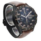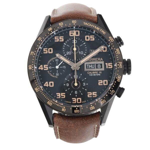 TAG Heuer Carrera black titanium automatic mens watch. Black chronograph dial, day & date, case diameter: 43mm, adjustable max wrist size: 18cm, Swiss made. Ref #CV2A84. With TAG Heuer brown leather strap and clasp. With Certificate of Authenticity, TAG Heuer International Warranty Card dated 09/04/2022 and TAG Heuer box. 3 month FSA warranty. (Pre-owned)
