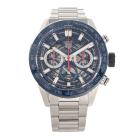 TAG Heuer Carrera stainless steel and ceramic automatic mens watch. Blue skeleton chronograph dial, date, case diameter: 43mm, wrist size: 20.5cm, Swiss made. Ref# CBG2011. With TAG Heuer stainless steel bracelet and clasp. With Certificate of Authenticity, TAG Heuer International Warranty card dated 01/04/2023 and TAG Heuer box. TAG Heuer manufacturer's warranty until 1/4/2025. (Pre-owned)