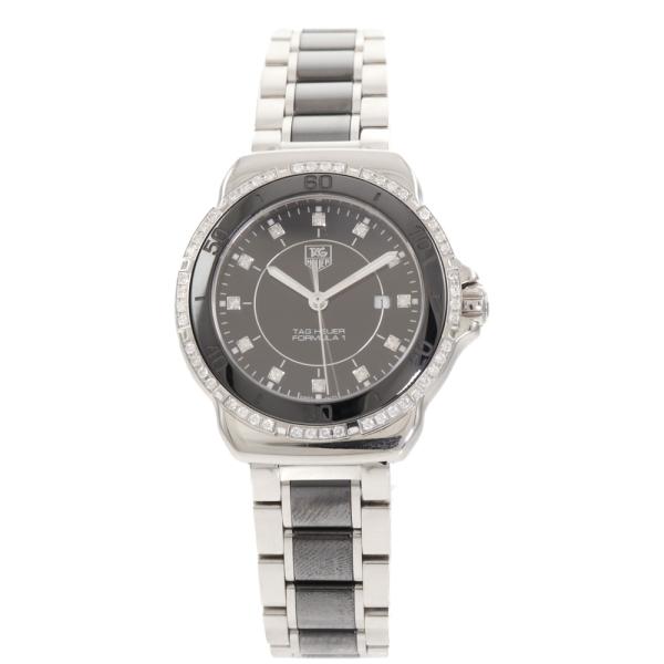 TAG Heuer Formula 1 stainless steel and ceramic quartz ladies watch. Black, dial, Diamond indicators, Diamond set bezel, case diameter: 32mm, wrist size: 19cm, Swiss made. Ref# WAH1312. With TAG Heuer two tone bracelet and clasp. With Certificate of Authenticity and TAG Heuer box. 3 month FSA warranty (Pre-owned)