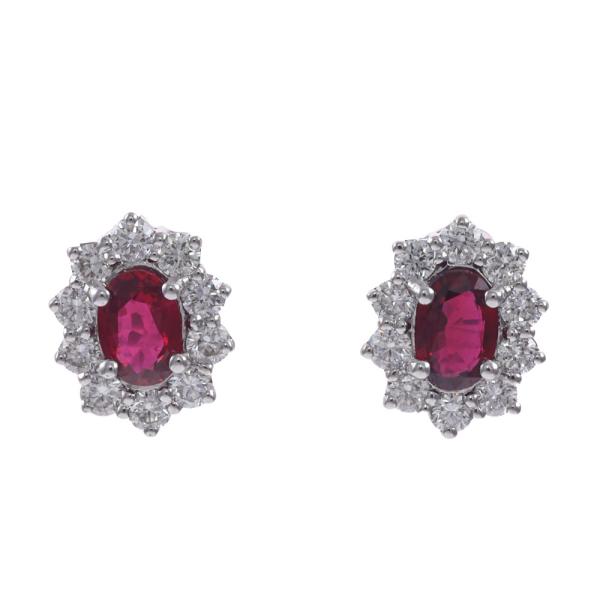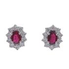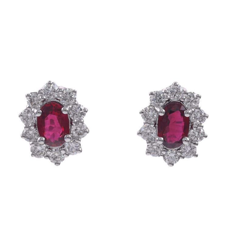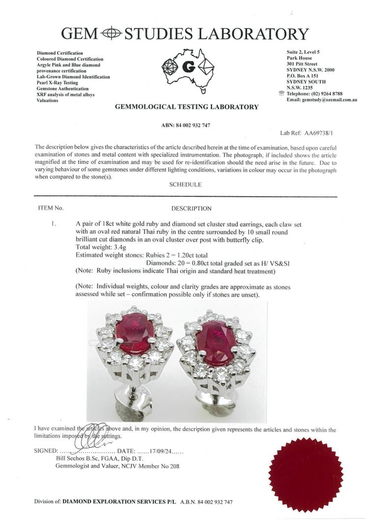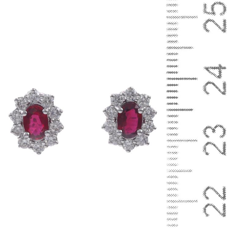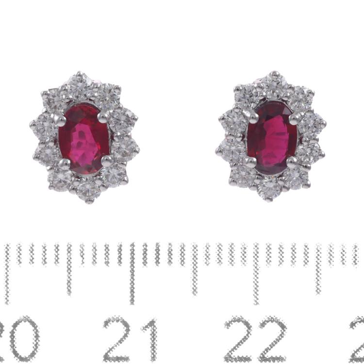 Ruby and Diamond cluster earrings with oval shape Natural Thai Rubies totalling 1.20ct and round Natural Diamonds totalling 0.80ct (Estimated grading: H VS-SI). 18ct white gold with 18ct white gold backs. Weight: 3.4g. With GSL Description Certificate #AA69738/1. (As new)