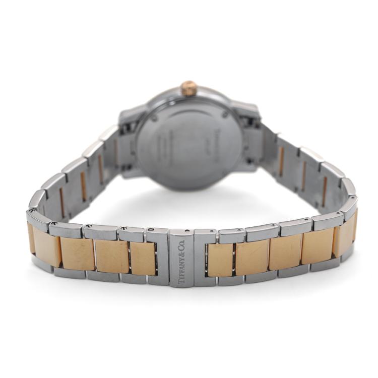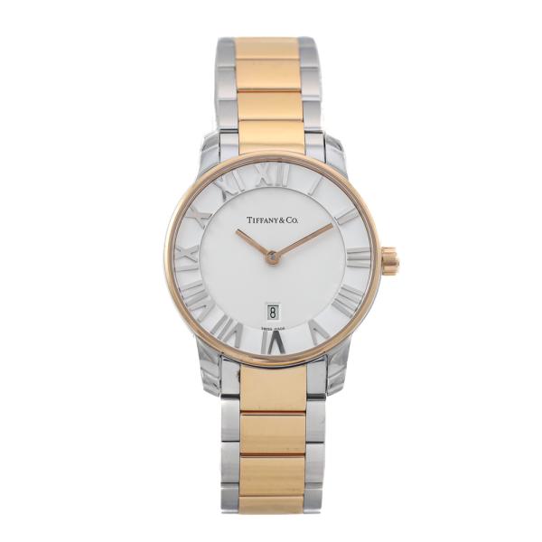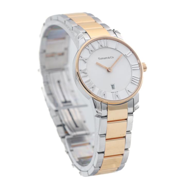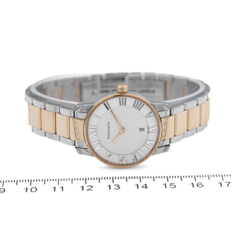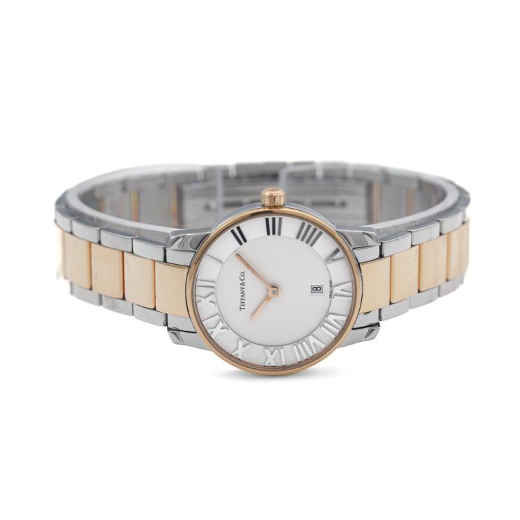 Tiffany & Co Atlas Dome stainless steel quartz ladies watch. White dial, date, case diameter: 29mm, wrist size: 18.5cm, Swiss made. Ref# Z1830.11.13A21A00A. With Tiffany & Co two-tone bracelet and clasp. With Certificate of Authenticity, Undated Tiffany & Co International Warranty card and Tiffany & Co box. No warranty applies. (Pre-owned)