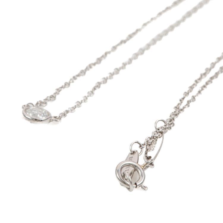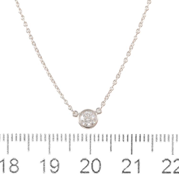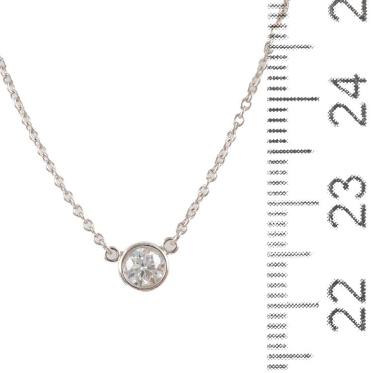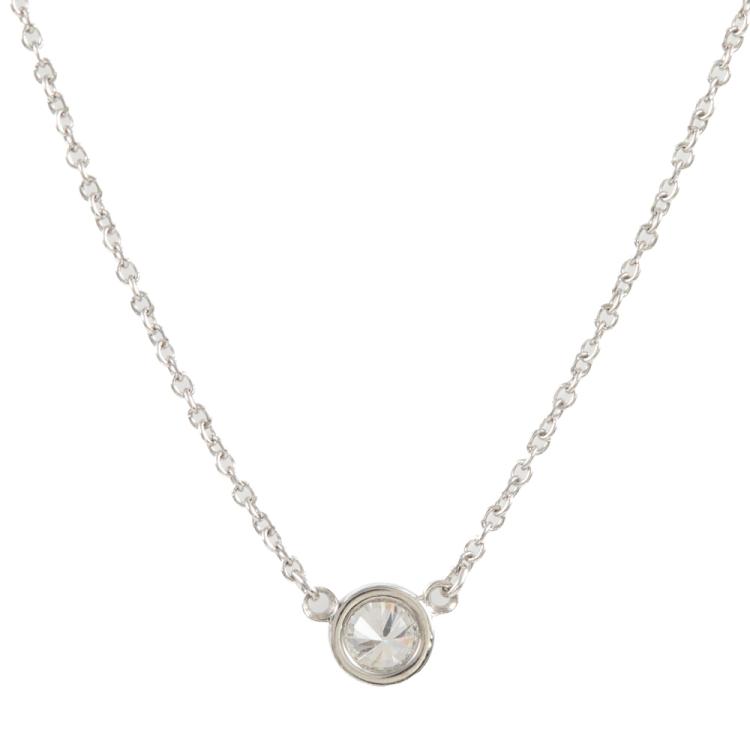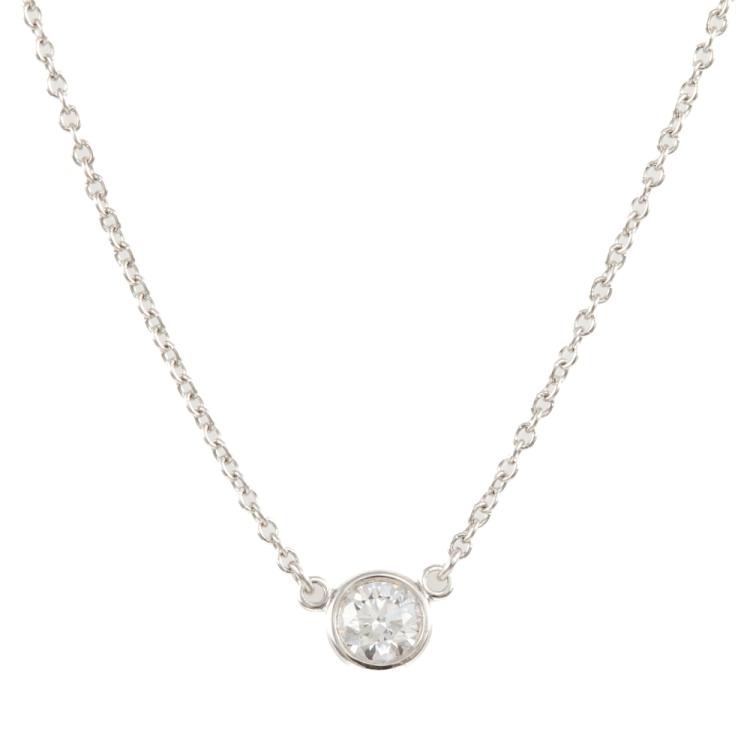 Tiffany & Co Elsa Peretti Diamonds by the Yard single Diamond pendant with a round Natural Diamond of 0.22ct (with Tiffany & Co Diamond Certificate graded as F VS1 #71138208/W07090702). Platinum 950 with attached Tiffany & Co platinum 950 chain. Length: 40cm. Weight: 2.5g. With Tiffany & Co Box. (Pre-owned)