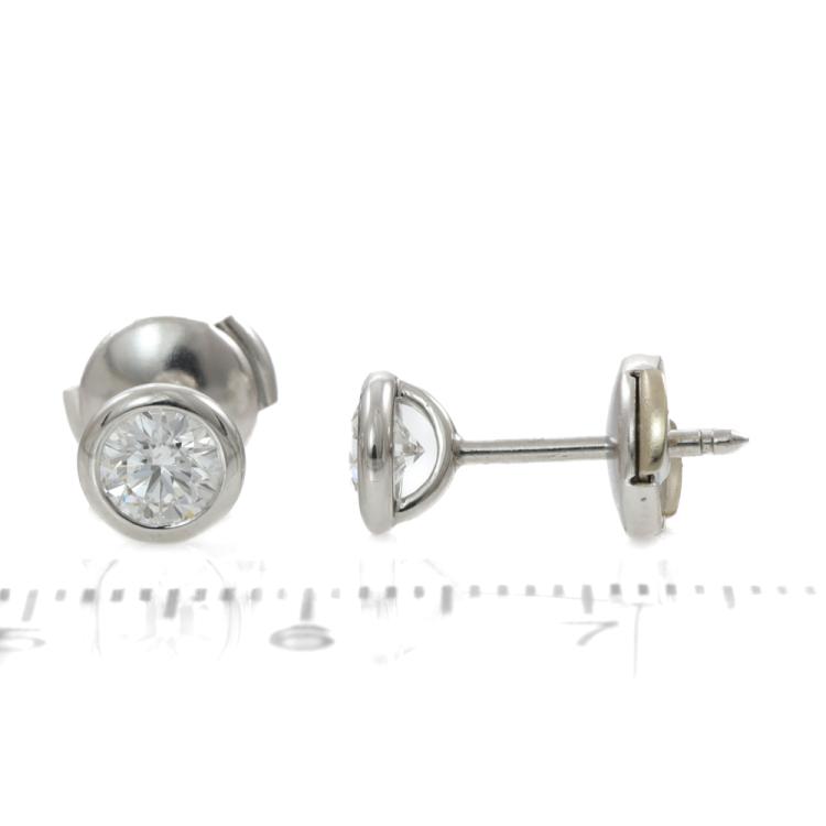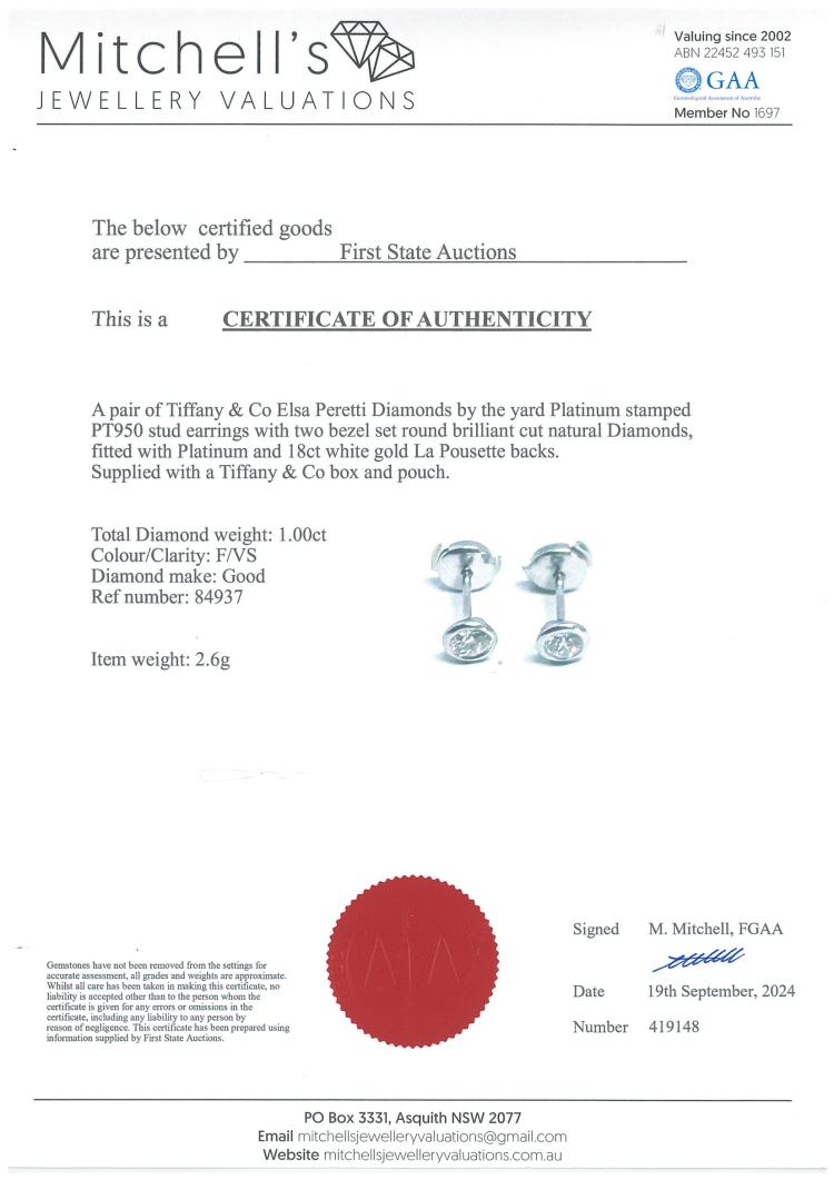 Tiffany & Co. Elsa Peretti Diamonds by the Yard stud earrings with 2 round Natural Diamonds totalling 1.00ct (Estimated grading: F VS). Platinum 950 with Tiffany & Co La Pousette backs in platinum 950 and 18ct white gold. Weight: 2.6g. With Tiffany & Co. box and pouch. With Certificate #419148. (Pre-owned)