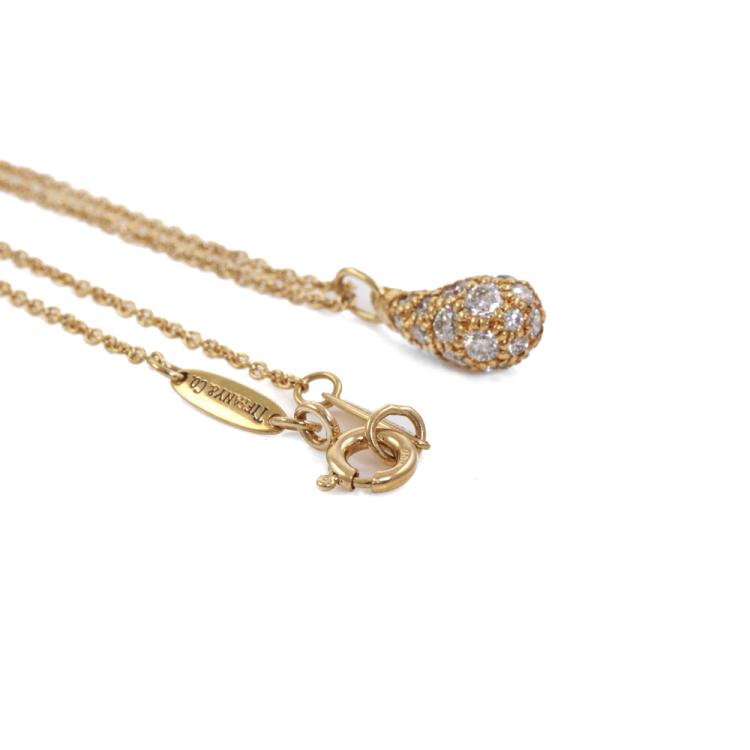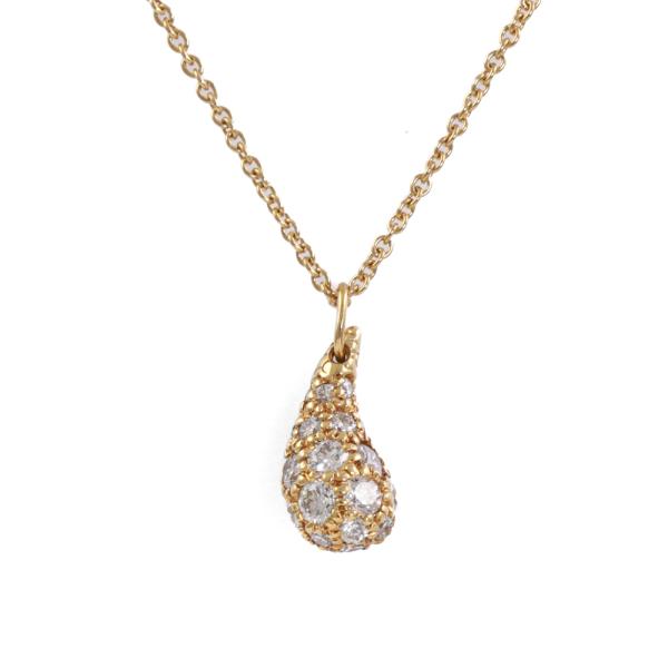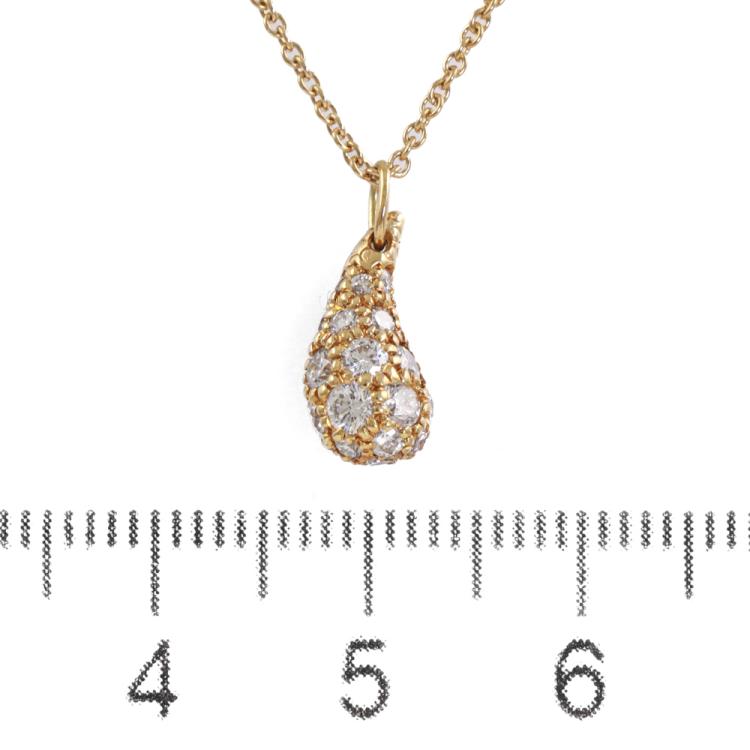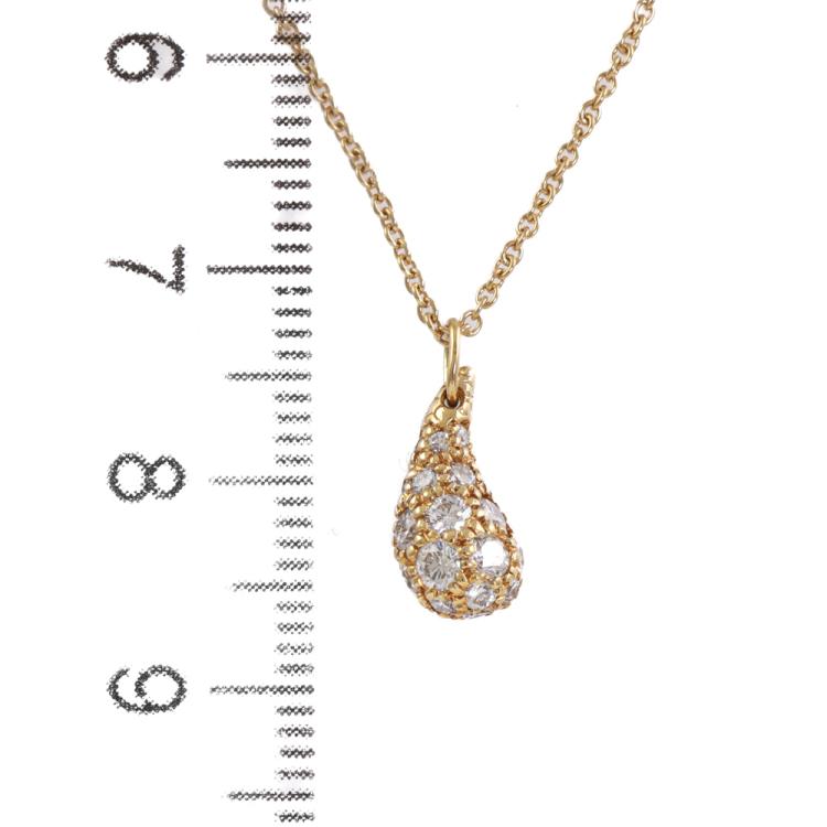 Tiffany & Co Elsa Peretti Teardrop Pendant with round Natural Diamonds totalling 0.75ct (Estimated grading: F-G VS). Motif size: 1.2cm x 0.6cm. 18ct yellow gold and 18ct yellow gold 40cm chain. Weight: 2.9g. (Pre-owned)