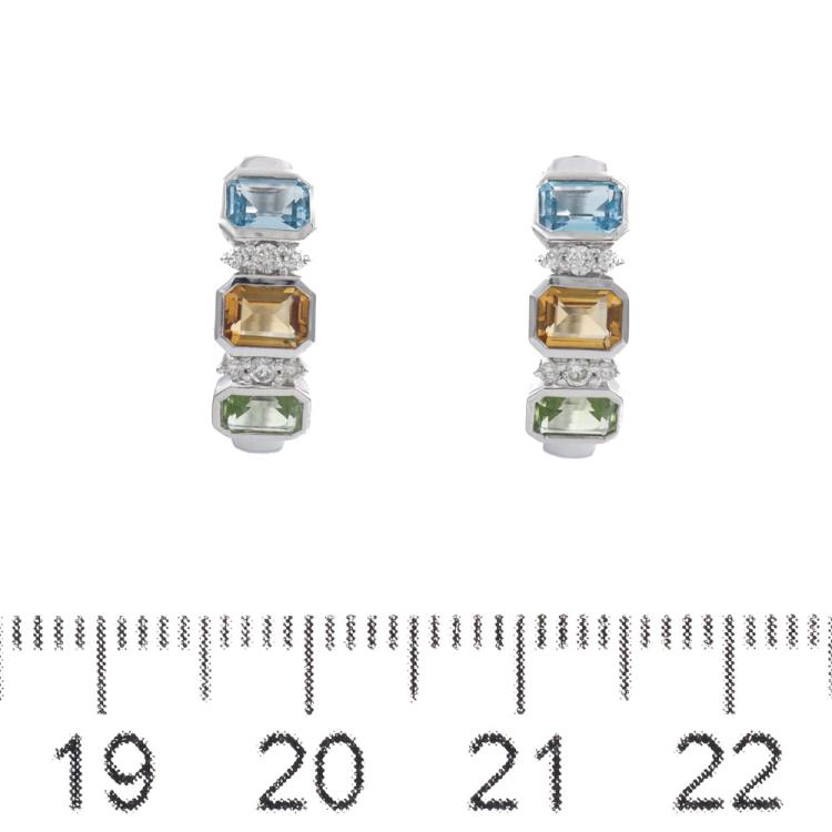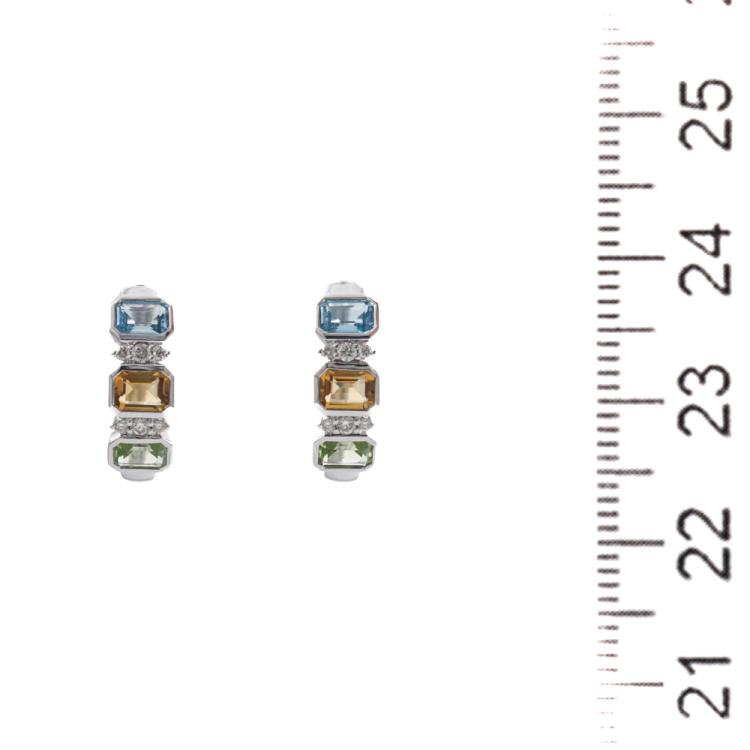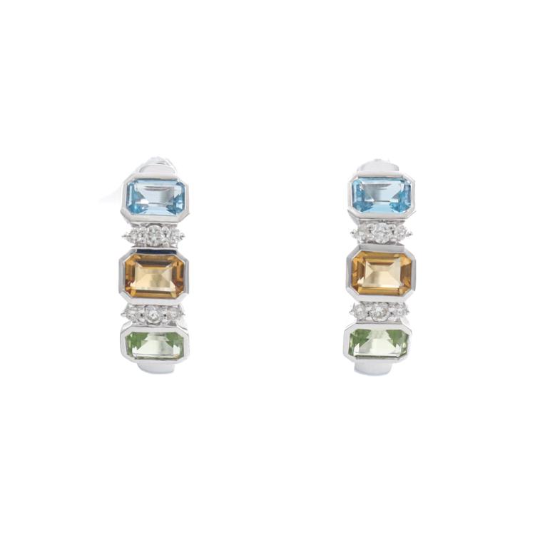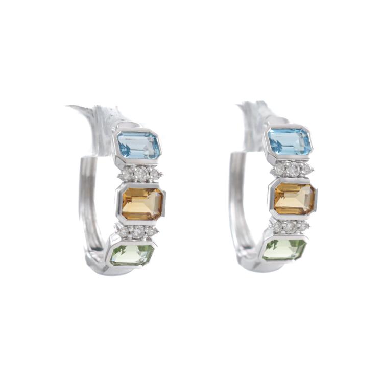 Huggie earrings with emerald cut Natural Blue Topaz totalling 0.42ct, emerald cut Natural Citrine totalling 0.34ct, emerald cut Natural Peridot totalling 0.39ct and round Natural totalling 0.09ct 14ct white gold. Weight: 2.6g (New)
