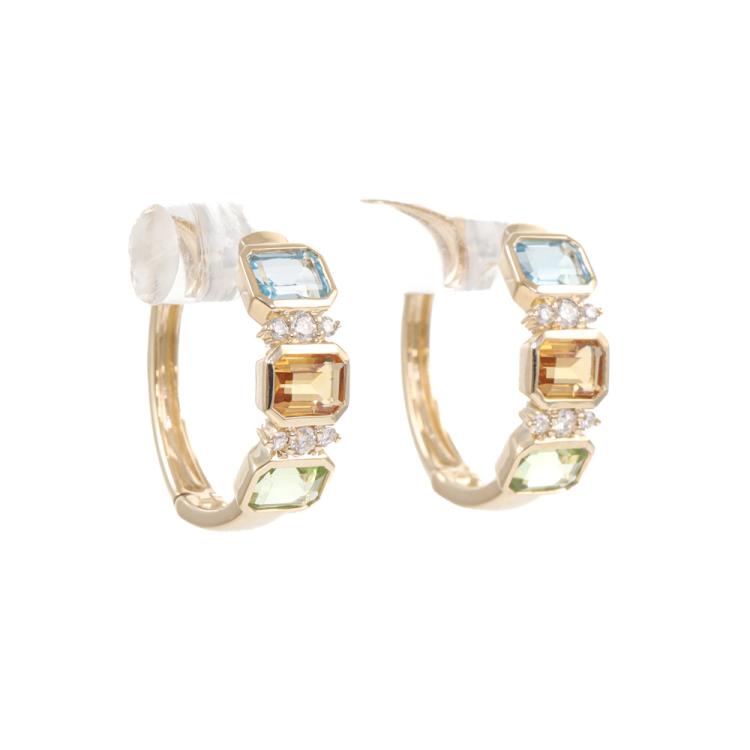 Topaz, Citrine, Peridot and Diamond earrings with emerald cut Natural Blue Topaz totalling 0.40ct, emerald cut Natural Citrine totalling 0.34ct, emerald cut Natural Peridot totalling 0.42ct and round Natural totalling 0.10ct 14ct yellow gold. Weight: 2.5g (New)