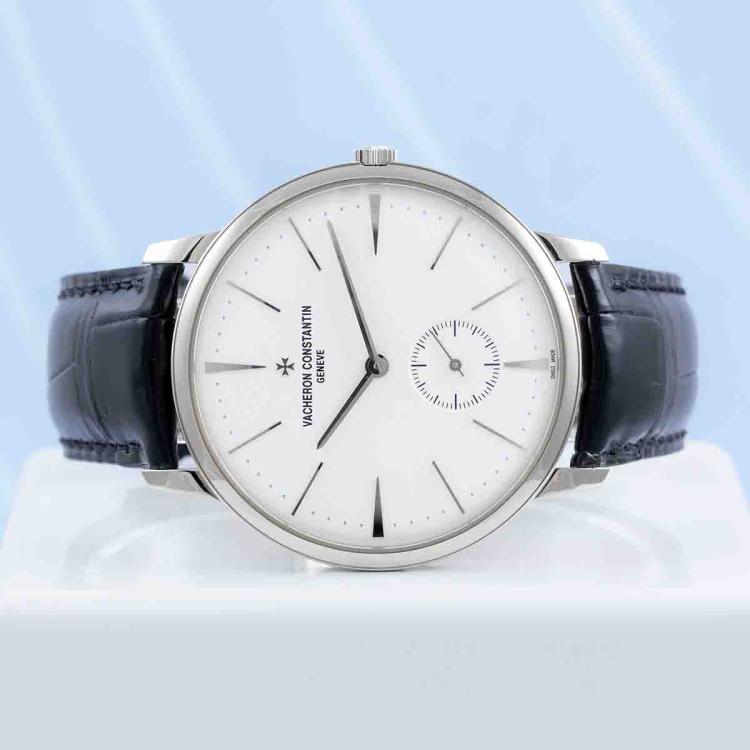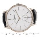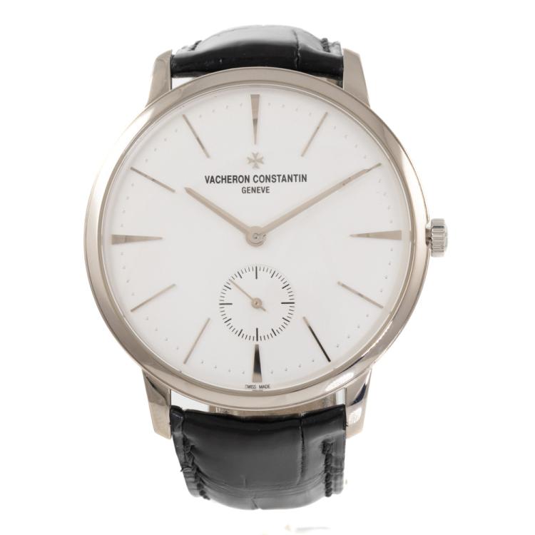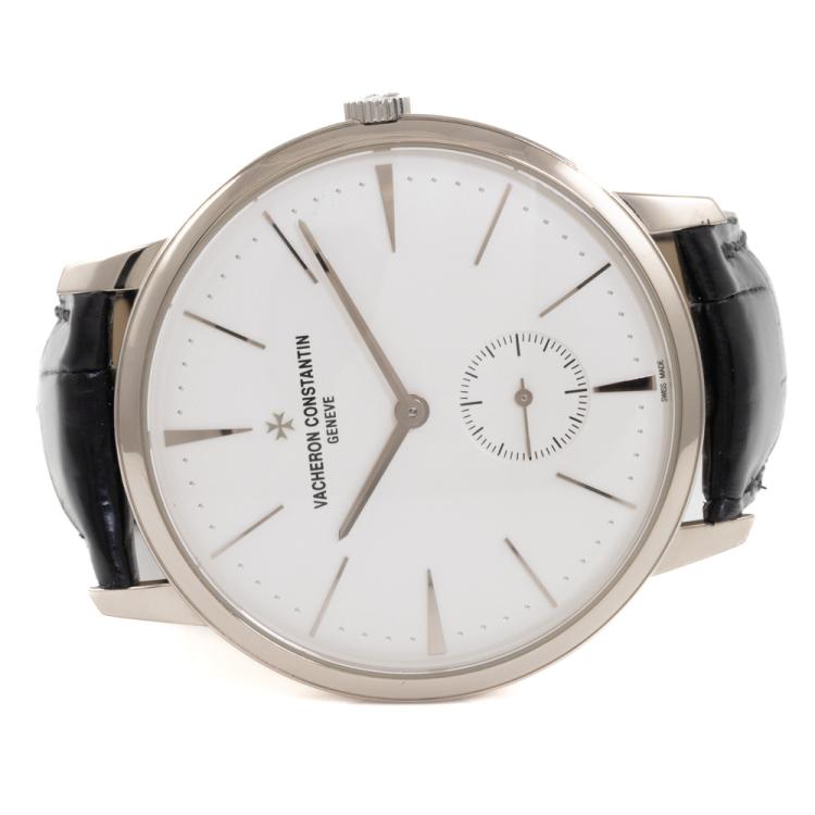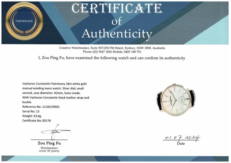 Vacheron Constantin Patrimony 18ct white gold manual winding mens watch. Silver dial, small second, case diameter: 42mm, strap length: 20.5cm, Swiss made. Ref# 1110U/000G. With Vacheron Constantin black leather strap and buckle. With Certificate of Authenticity. 3 month FSA warranty. (Pre-owned)