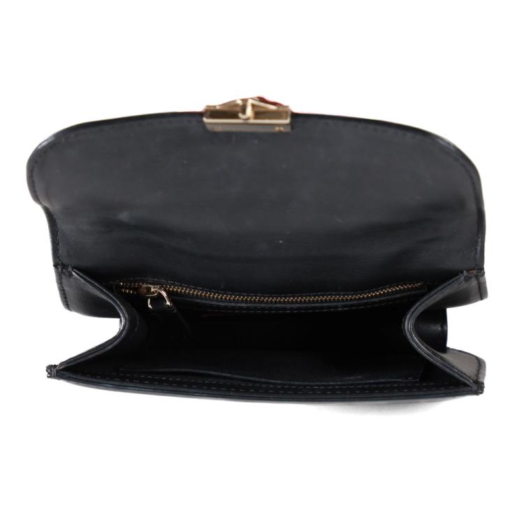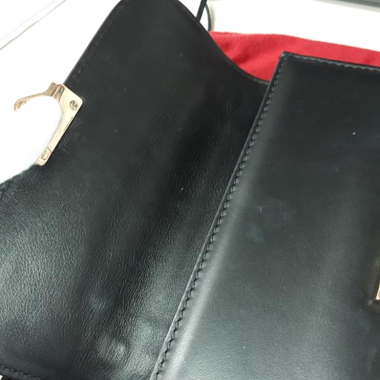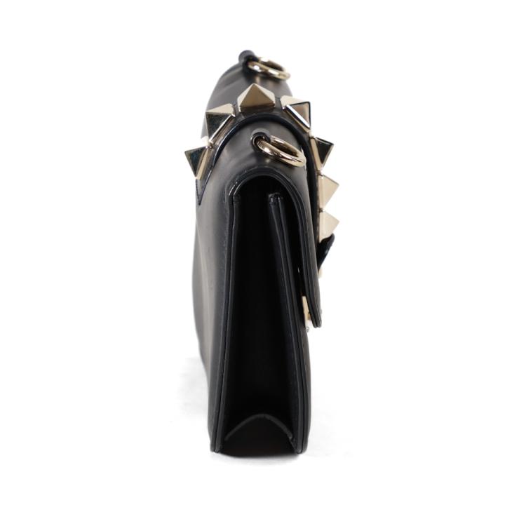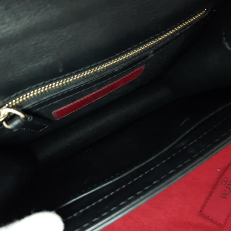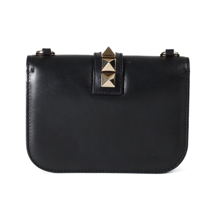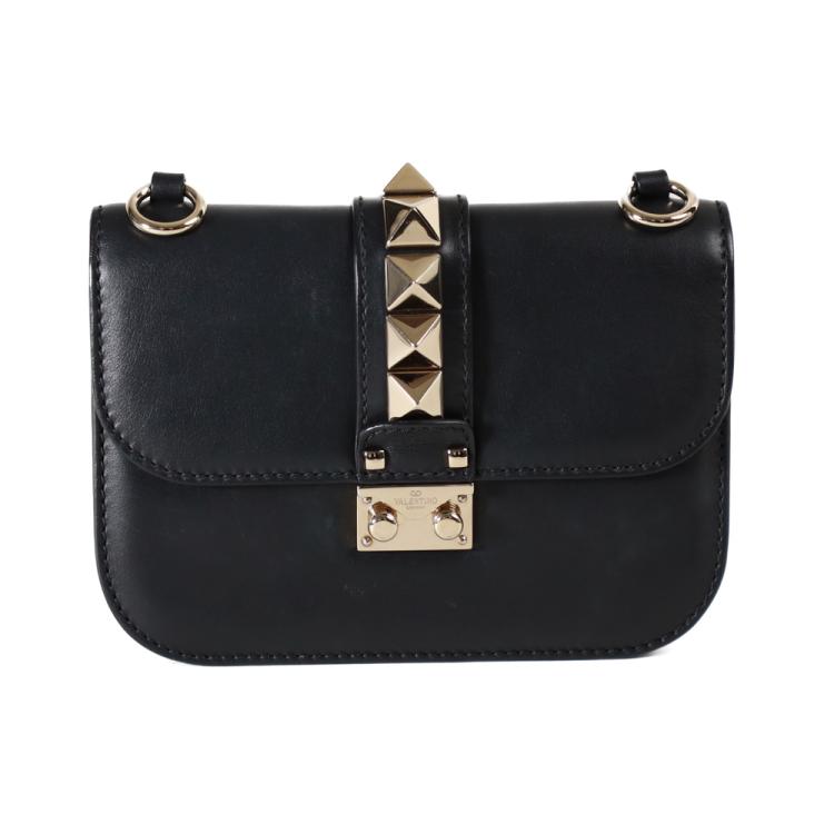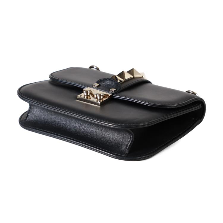 Valentino Garavani Glam lock small shoulder bag in black calfskin leather. Featuring light gold-toned hardware, Valentino stud details, front flap with interlocking closure. This opens to a black textile interior with a zipper and patch pokets. Approximate dimensions: 20cm(L) x 15cm(H) x 4.5cm(D), strap drop 59cm. NOTE: chain shoulder strap is broken. Accompanied by Valentino spare studs, tag and dustbag. With David Jones purchase receipt dated 03/08/2016. (Pre-owned)