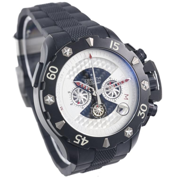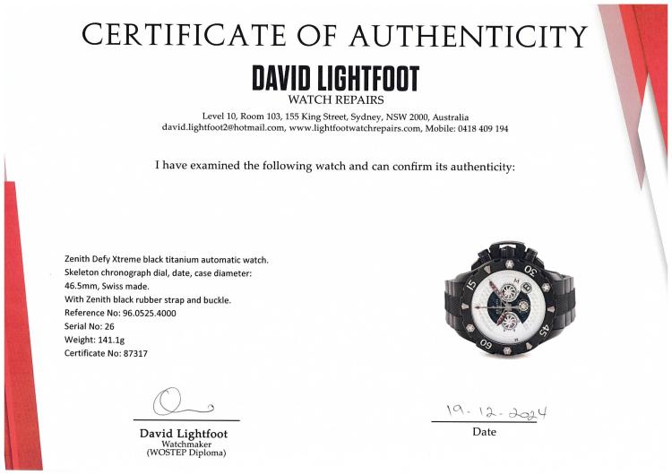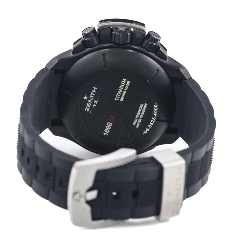 Zenith Defy Xtreme black titanium automatic mens watch. Skeleton chronograph dial, date, case diameter: 46.5mm, strap length: 22cm, Swiss made. Ref# 96.0525.4000. With Zenith black rubber strap and buckle. With Certificate of Authenticity. 3 month FSA warranty. (Pre-owned)