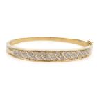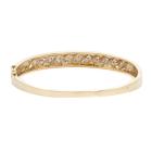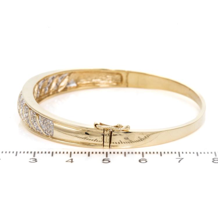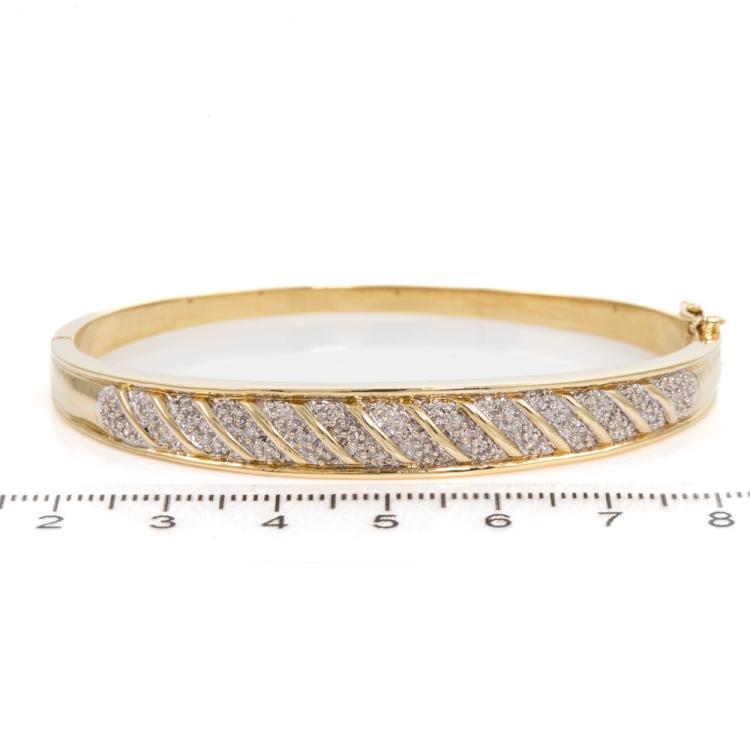 Diamond bangle with round Natural Diamonds totalling approximately 0.16cts. 9ct yellow gold. Circumference: 17.5cm. Note hinge is slightly worn. Weight: 17.6g. Width: 3.1mm-8.8mm. (Pre-owned)